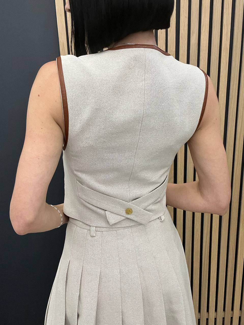 Жилет Miu Miu LUX-106831 — это воплощение элегантности и изысканности. Этот жилет, выполненный в бежевом цвете, обладает классическим дизайном с коричневыми кожаными деталями по краям, что придает ему особый шарм. Он идеально подходит для создания стильных образов, будь то повседневный или деловой стиль.