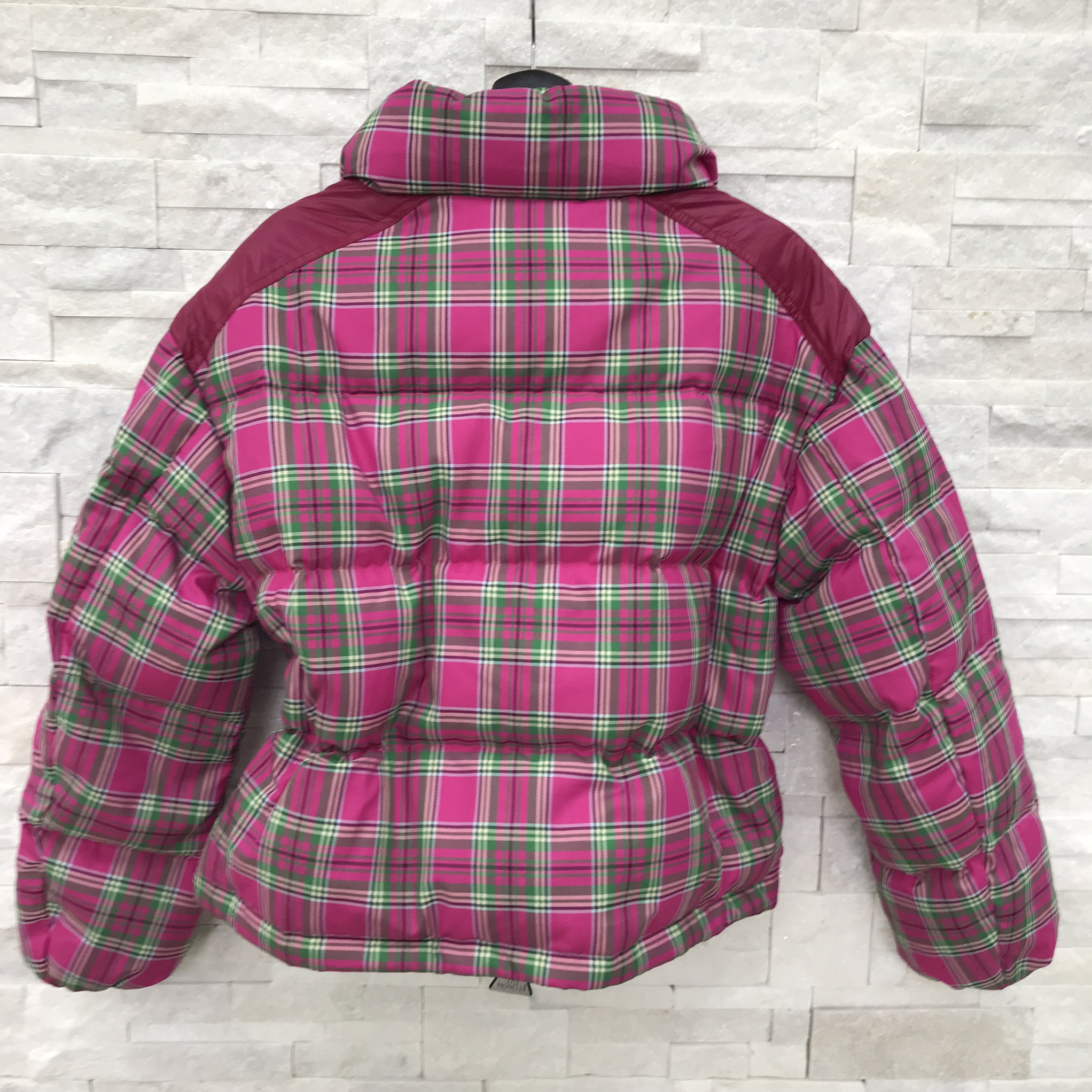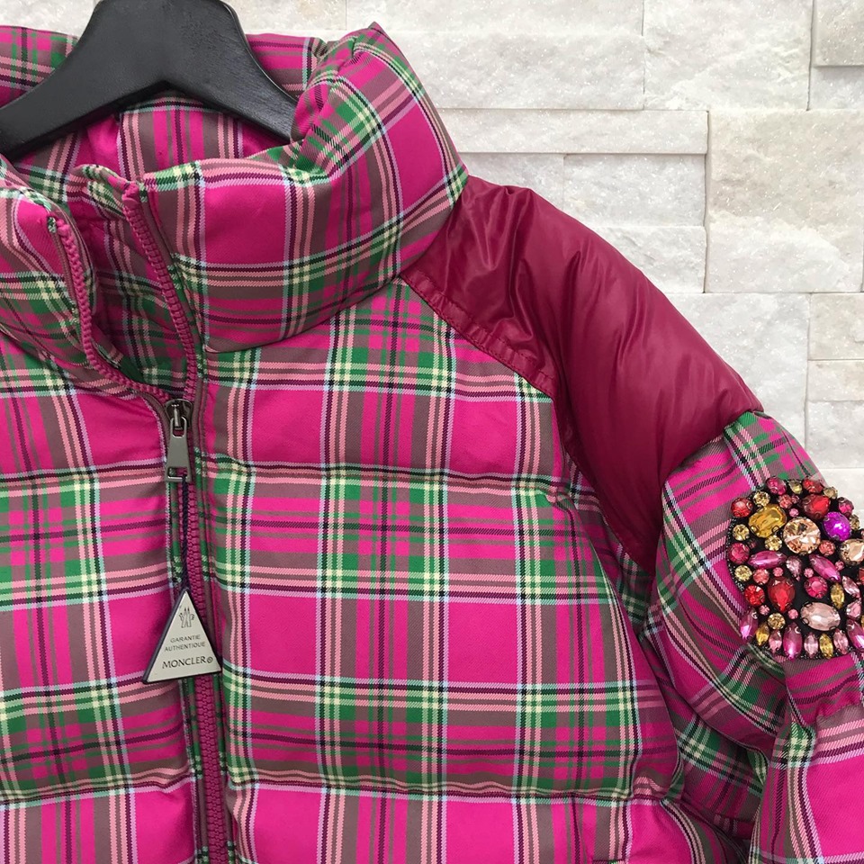 Пуховик Moncler LUX-17091 представляет собой яркое и стильное решение для современной женщины. Этот пуховик сочетает в себе трендовый клетчатый принт в оттенках фуксии и зеленого с контрастными бордовыми вставками на плечах. Декоративный элемент из камней на рукаве добавляет изделию уникальности и шика. Пуховик отлично подойдет для создания эффектных повседневных образов в холодное время года.