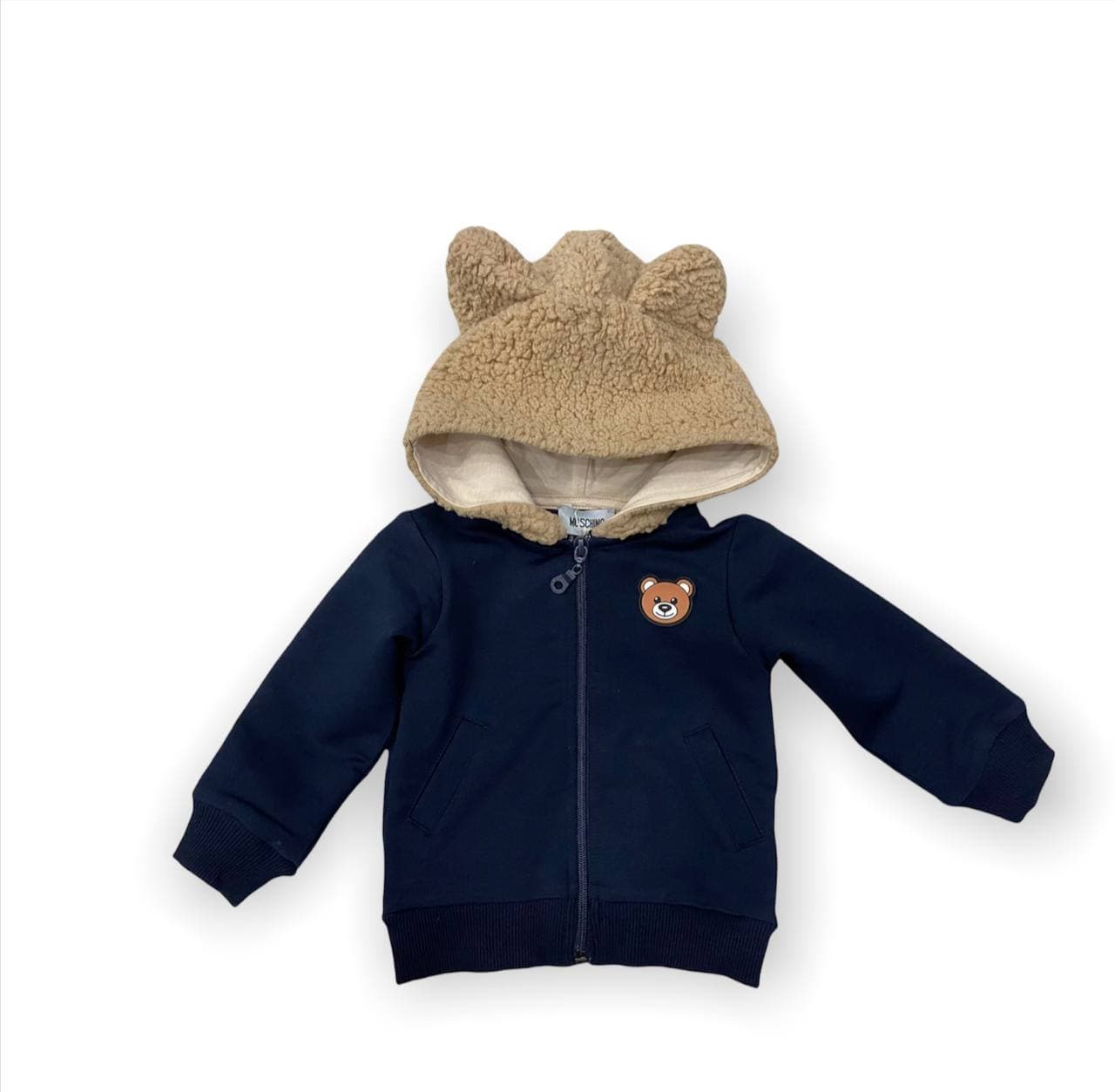 Бомбер Moschino LUX-62759 представляет собой стильную детскую модель с очаровательным дизайном. Темно-синяя основа дополнена капюшоном с мягкой плюшевой отделкой и ушками, напоминающими медвежьи. На груди красуется вышитый мотив знаменитого медвежонка Moschino. Удобная застежка-молния и манжеты обеспечивают комфорт и практичность.