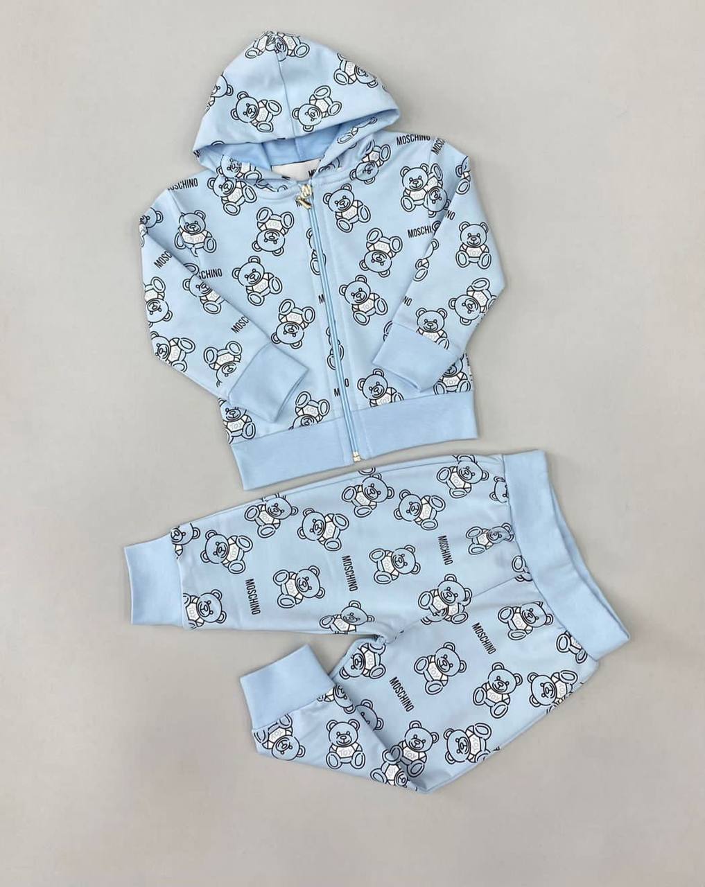 Костюм Moschino LUX-72339 - это стильный комплект для детей, включающий худи на молнии с капюшоном и спортивные штаны. Комплект выполнен в нежно-голубом цвете с принтом мишек, что придает ему игривый и узнаваемый вид. Этот костюм идеально подходит для повседневной носки, обеспечивая комфорт и свободу движений.