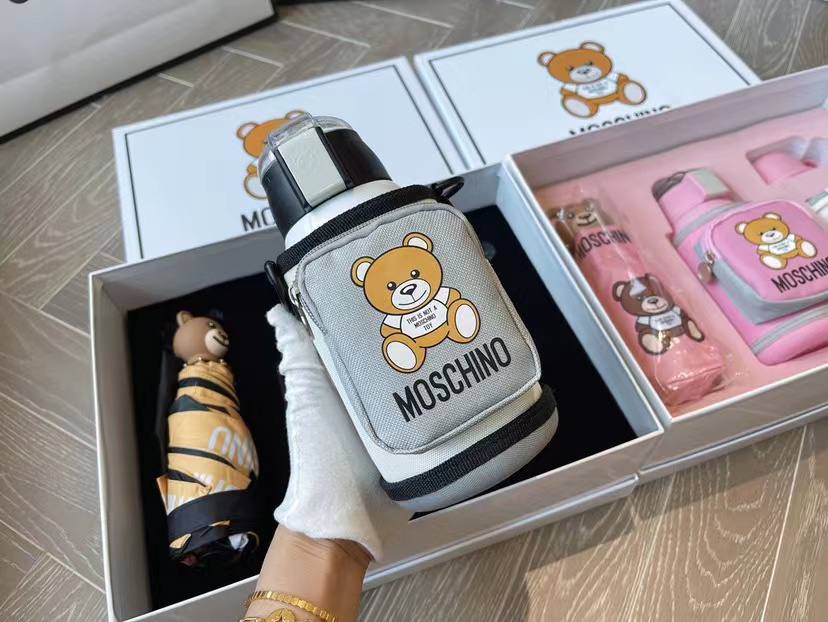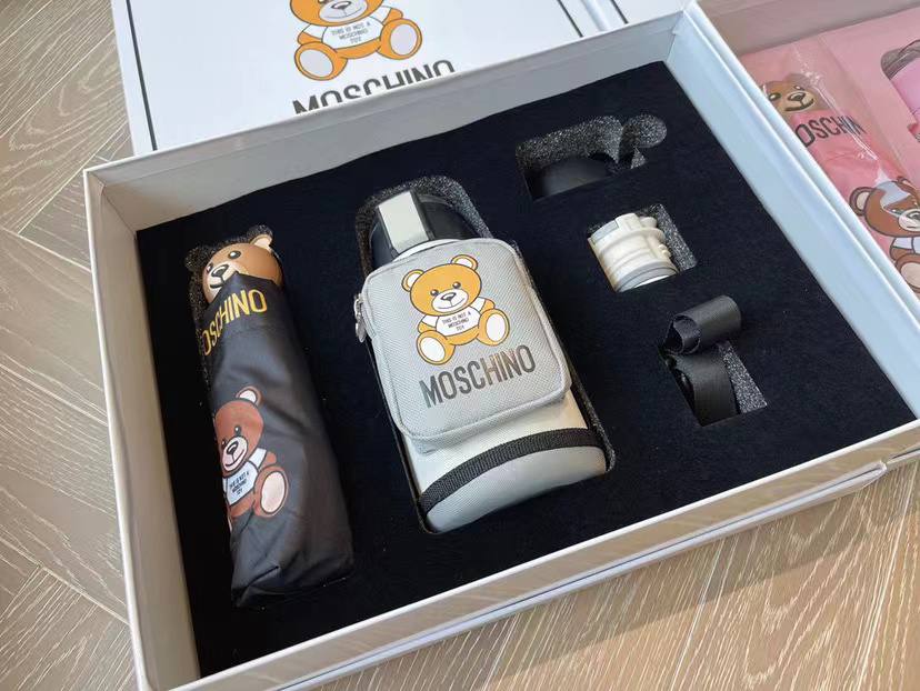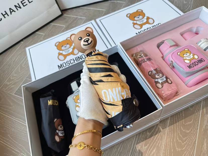 Набор подарочный Moschino LUX-87695 - это стильный и функциональный комплект, включающий в себя зонт, небольшую сумку и другие аксессуары, выполненные в фирменном стиле бренда. Черный зонт с изображением медвежонка и надписью, сумка в серо-белых тонах, с узнаваемым логотипом.
