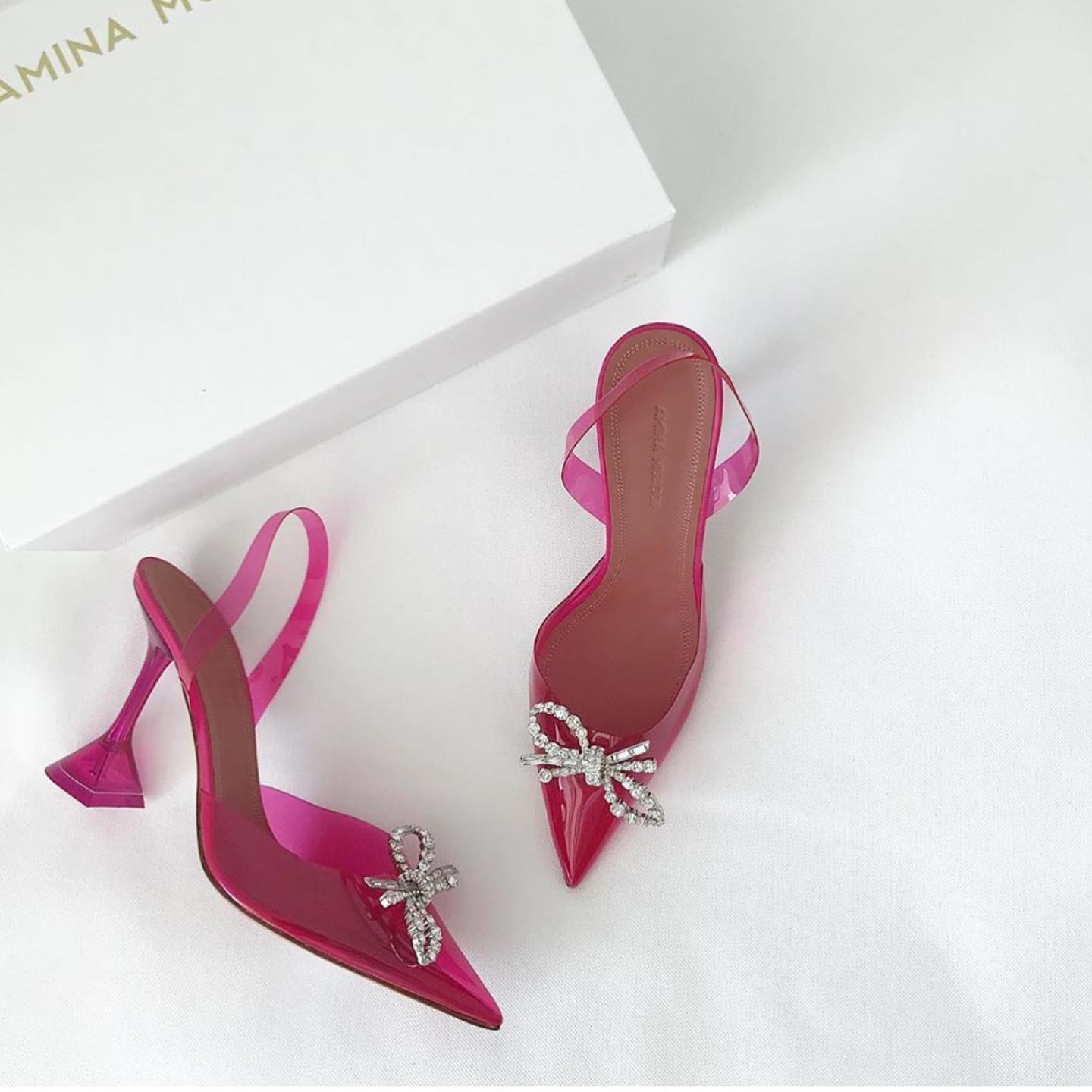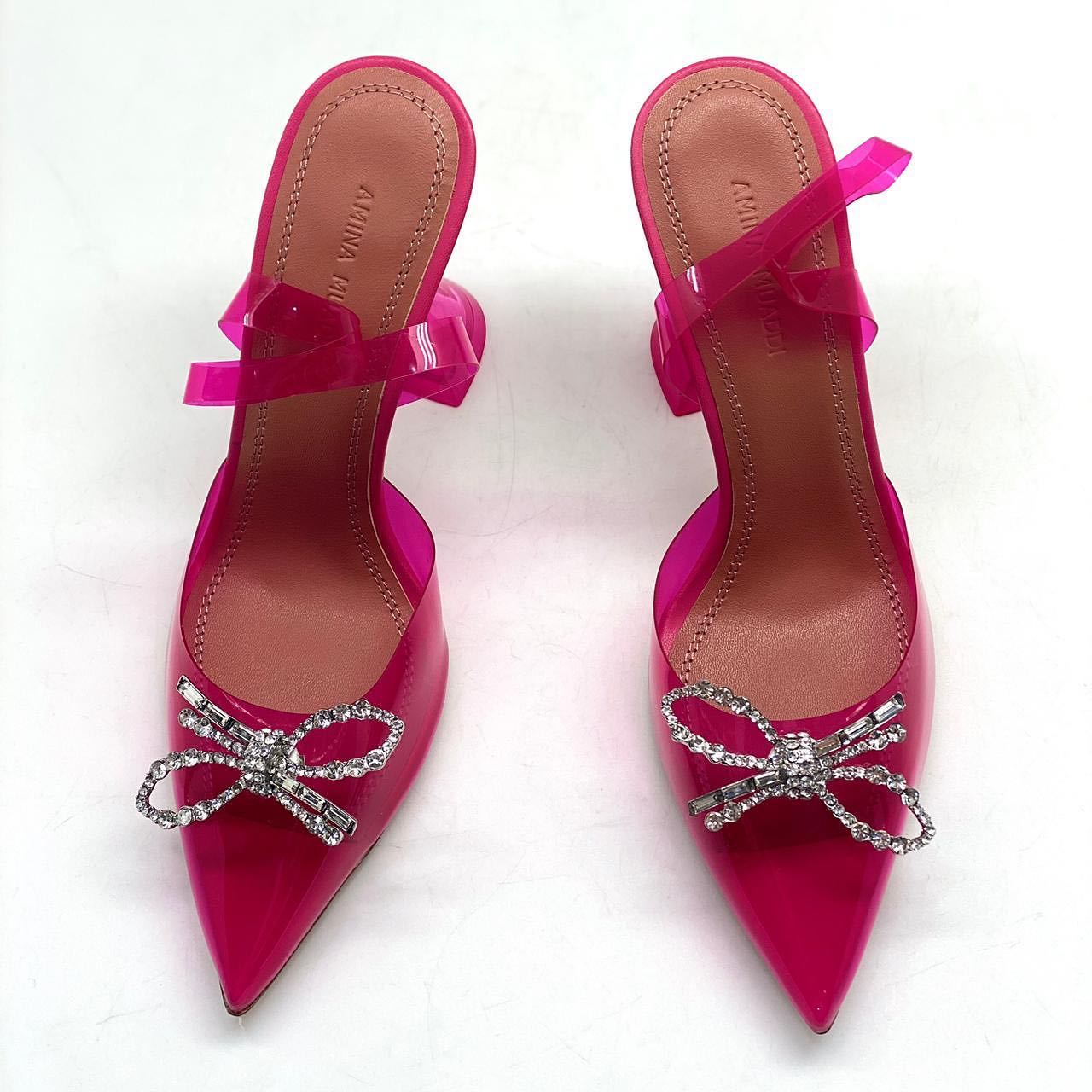 Мюли Amina Muaddi LUX-32237 – это эффектная обувь, сочетающая в себе смелый дизайн и изысканные детали. Прозрачный материал верха, яркая фуксия и сверкающий декор в виде банта делают эти мюли настоящим акцентом любого образа. Модель идеально подходит для создания вечерних и праздничных нарядов.