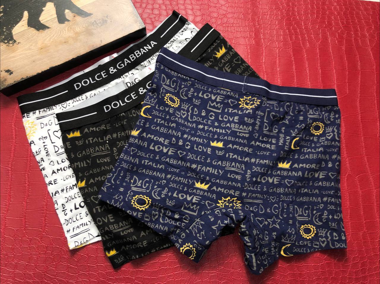 Набор Dolce & Gabbana LUX-65582 представляет собой мужские трусы-боксеры, выполненные в стилистике знаменитого итальянского бренда. Изображение на ткани, включающее повторяющиеся элементы логотипа, сердца, звезды и надписи "AMORE" и "FAMILY", придает изделию узнаваемый и модный вид. Этот набор станет отличным дополнением к гардеробу ценителей комфортного белья с выразительным дизайном.
