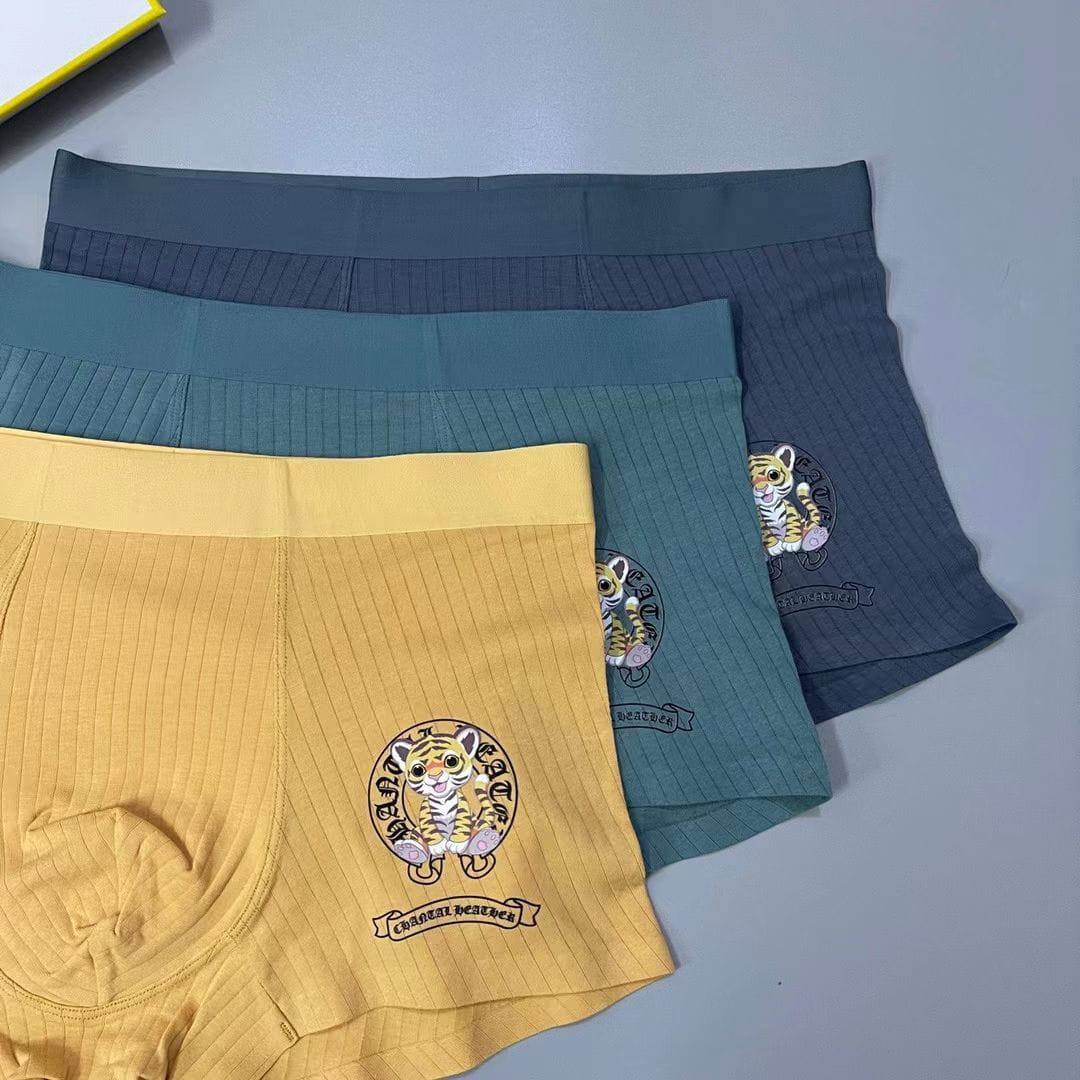 Набор CHROME HEARTS LUX-82301 - это стильное нижнее белье в современном стиле. Комплект представлен в трех цветовых решениях: желтом, зеленом и синем. Каждые трусы украшены принтом с тигром.