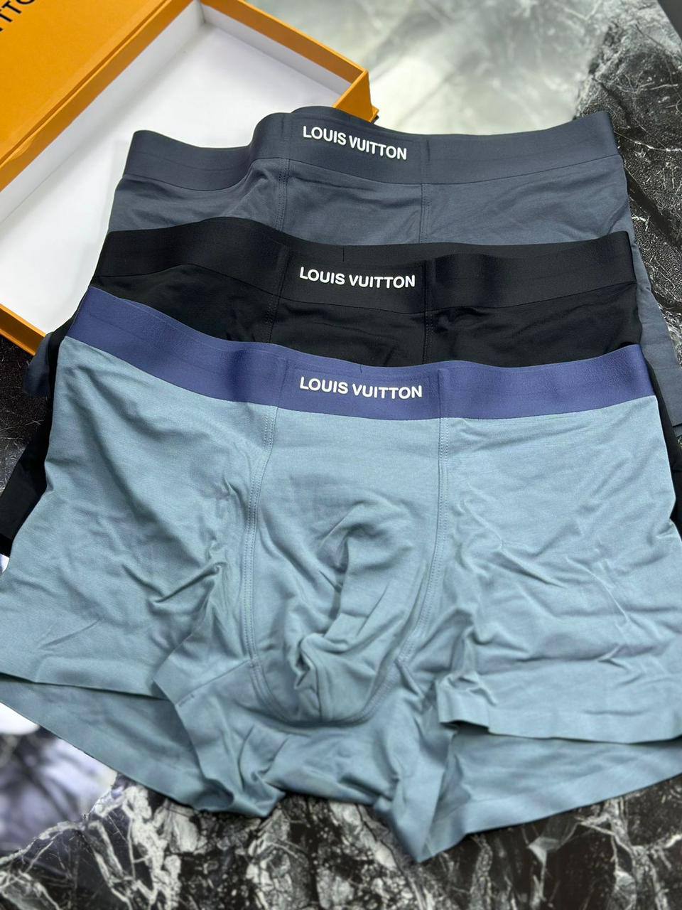 Набор из 3-х боксеров Louis Vuitton LUX-96159 – это комплект стильных и комфортных боксеров. Представлены в трех классических цветах: сером, черном и светло-голубом. Данные боксеры отлично подойдут для повседневной носки, обеспечивая комфорт и уверенность в себе.