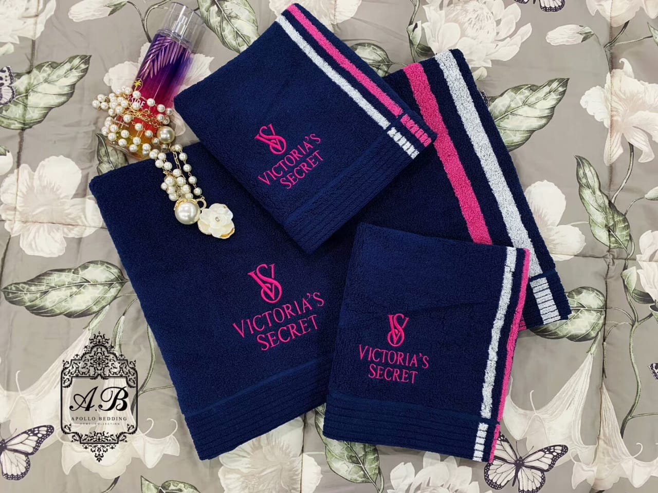 Набор полотенец Victoria`s Secret LUX-24426 представляет собой элегантный комплект, выполненный в глубоком темно-синем цвете. На каждом полотенце вышито узнаваемое лого Victoria`s Secret ярко-розовым цветом, что придает изделиям изысканный вид. По краям некоторых полотенец проходит декоративная полоса из тонких розовых и белых полосок, добавляющая стильный акцент. Этот набор отлично подойдет для создания атмосферы роскоши и уюта в ванной комнате, а также может стать прекрасным подарком.