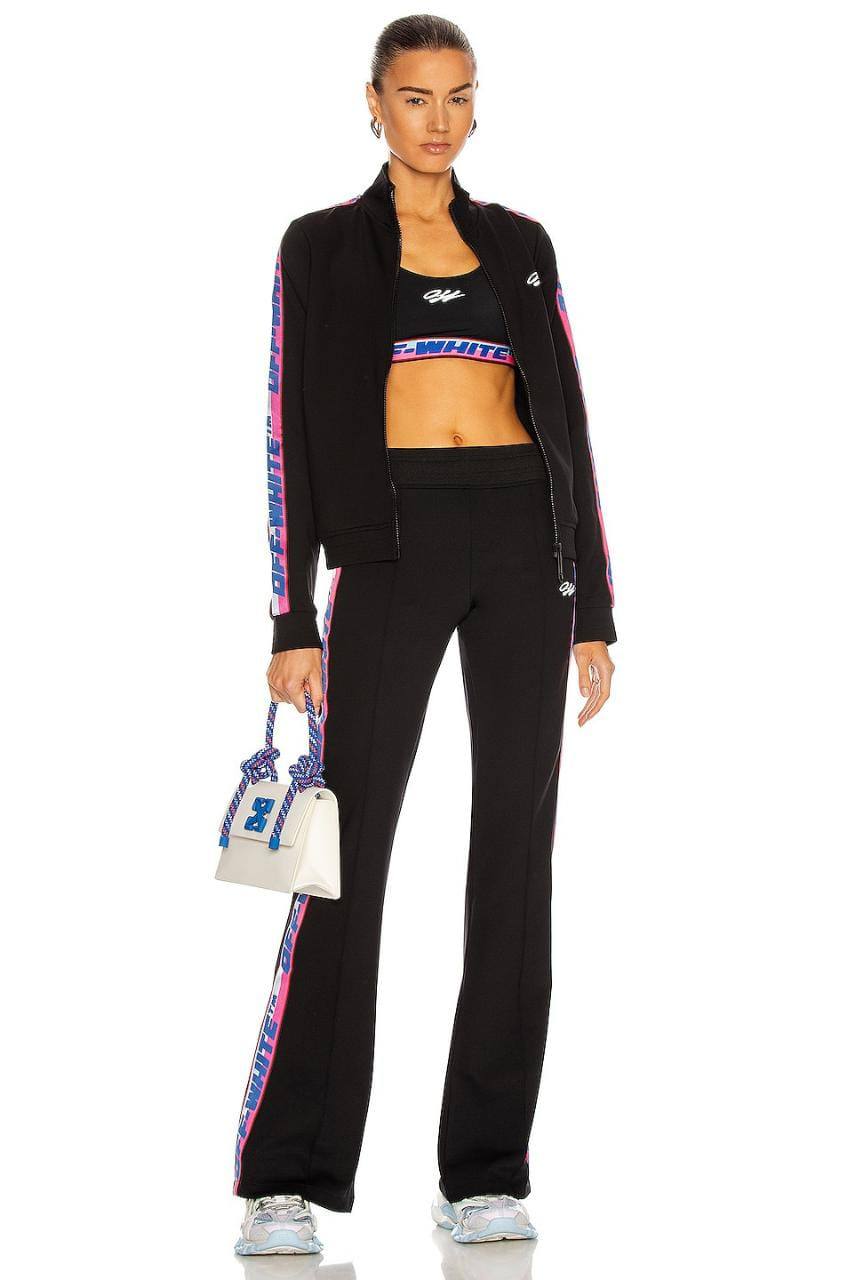 Костюм Off-White™ LUX-51617 представляет собой стильный комплект, сочетающий спортивный дизайн и узнаваемый стиль бренда. Черный цвет костюма дополнен контрастной отделкой с логотипами Off-White™, выполненной в ярких розовых и голубых тонах, что придает ему динамичность и индивидуальность. Этот костюм идеально подходит для создания модного образа как для активного отдыха, так и для повседневного ношения.