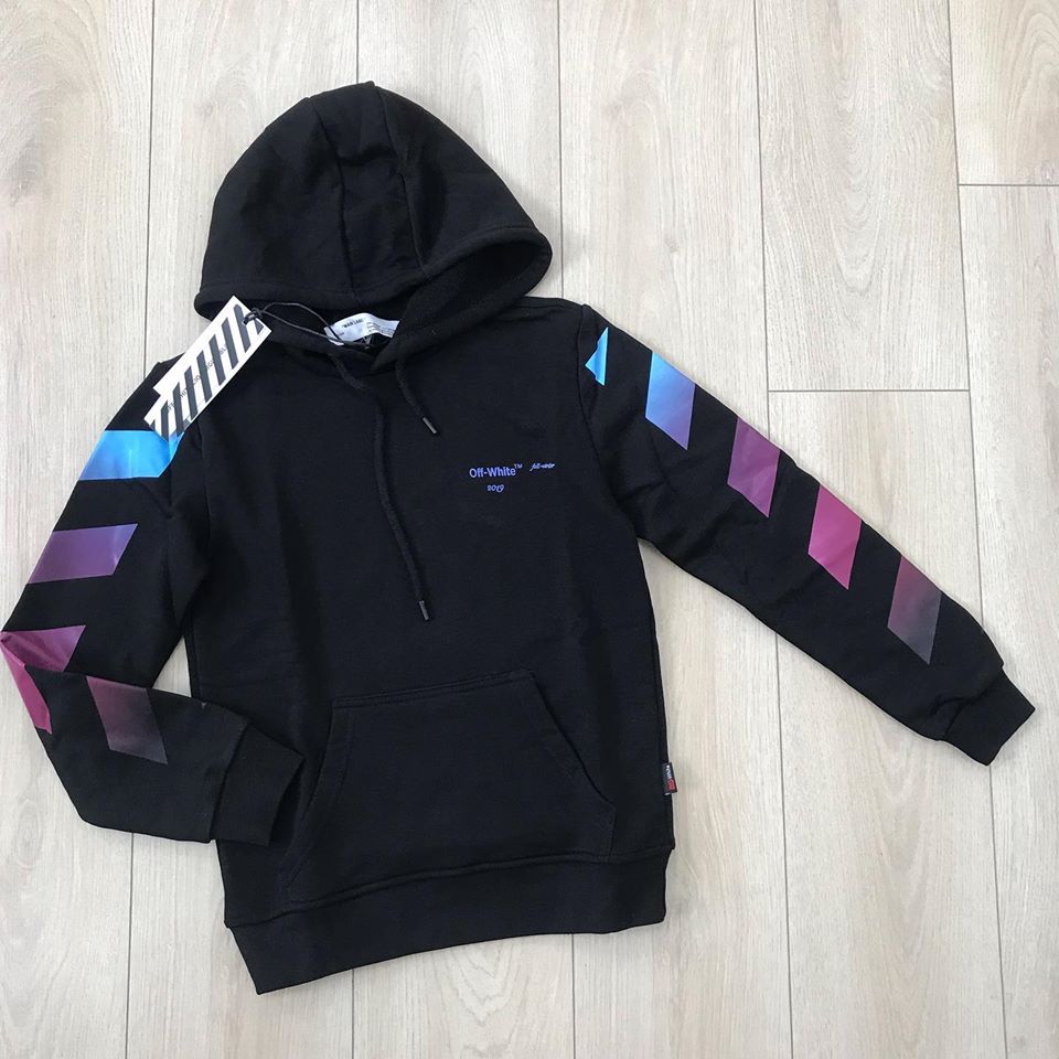 Толстовка Off-White™ LUX-29931 — это стильная черная худи с ярким дизайном. Модель от известного бренда Off-White™ привлекает внимание градиентной полосой на рукавах, переходящей от синего к фиолетовому и розовому оттенкам. Она идеально подходит для создания современных и трендовых образов.