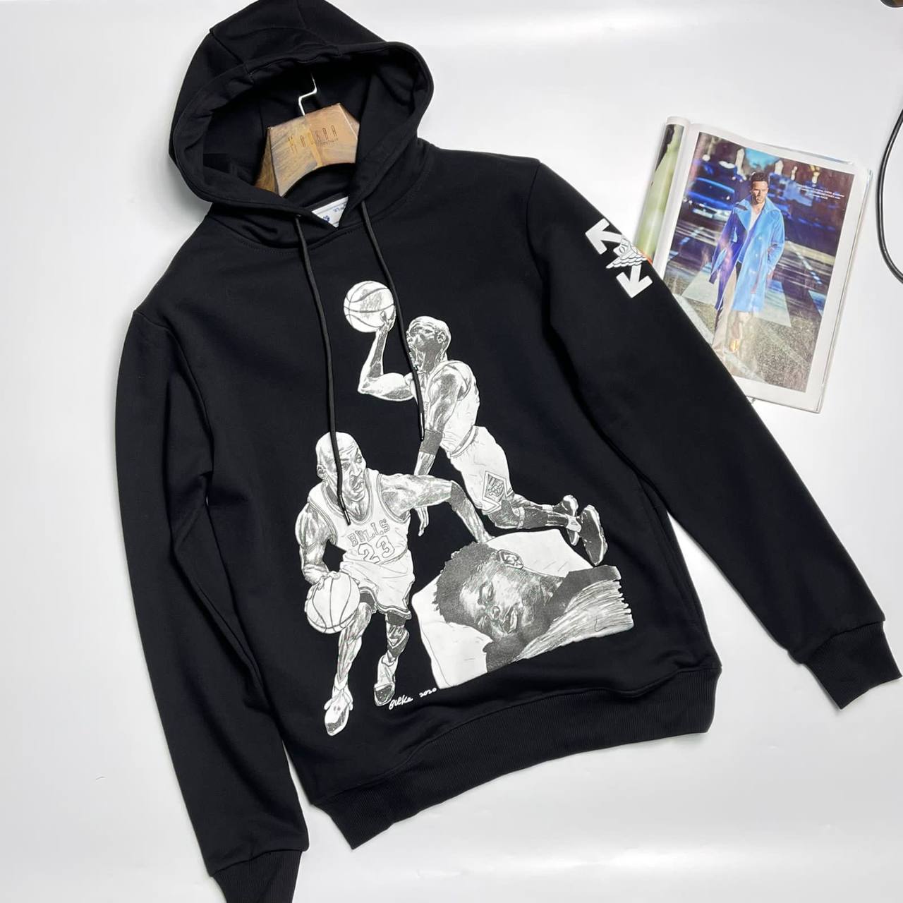 Толстовка мужская Off-White™ LUX-80069 — это стильный предмет гардероба, выполненный в современном дизайне. Толстовка чёрного цвета с графическим принтом, представляющим собой изображение баскетболистов. Этот предмет одежды идеально подойдёт для повседневного ношения, сочетая в себе комфорт и современный стиль.