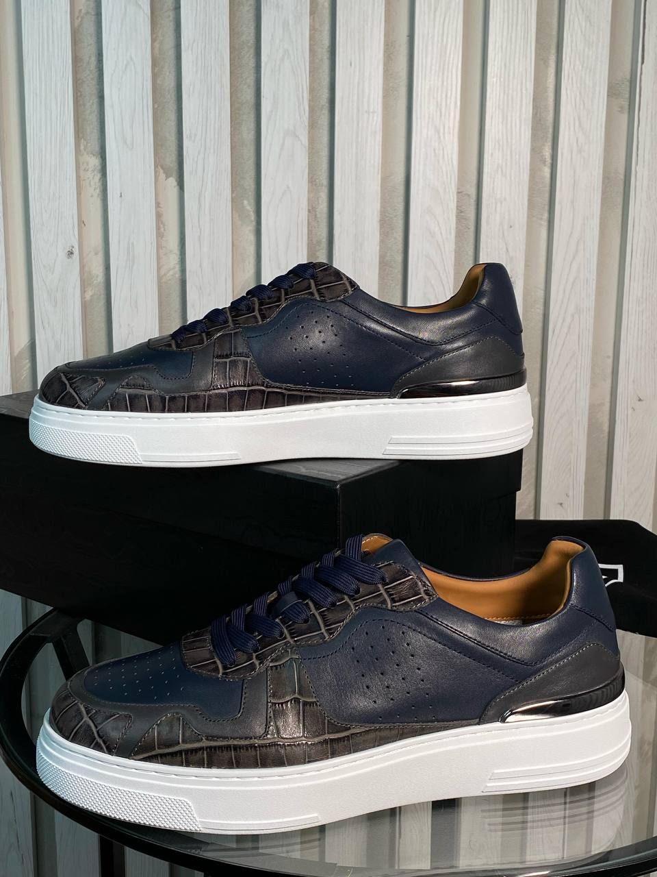 Кеды Philipp Plein LUX-103062 — это стильная обувь в спортивном стиле. Основной цвет — темно-синий, с элементами текстуры под кожу крокодила. Кеды подойдут для повседневной носки, подчеркивая индивидуальность своего обладателя.