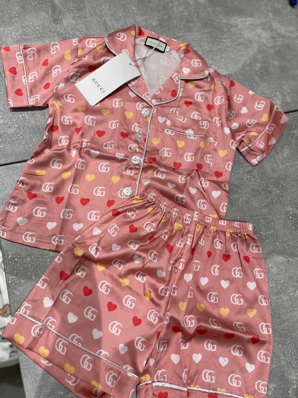 Пижама Gucci, модель LUX-119898, представляет собой стильный комплект для сна. Розовая пижама с коротким рукавом и шортами, украшена узнаваемым принтом в виде монограмм бренда и сердечками, выглядит изысканно. Этот комплект идеален для комфортного и элегантного отдыха дома.