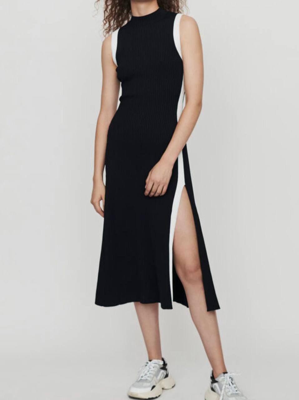 Платье LUX-77796 — это элегантное платье миди, выполненное в минималистичном стиле. Модель имеет приталенный силуэт и открытые разрезы по бокам, что добавляет образу динамичности. Платье выполнено в черном цвете с белыми контрастными вставками.