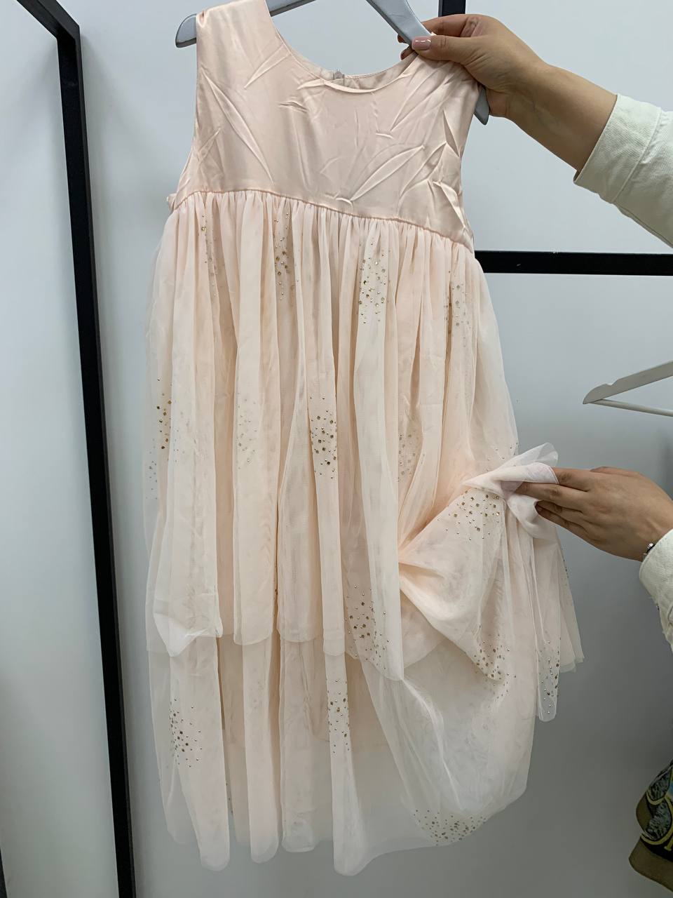 Это нежное платье от LUXE-CRIME, артикул LUX-68208, выполнено в романтичном стиле, идеально подойдет для особых случаев. Его многослойная юбка из легкой ткани, украшенная мерцающими элементами, создает ощущение воздушности и праздника.