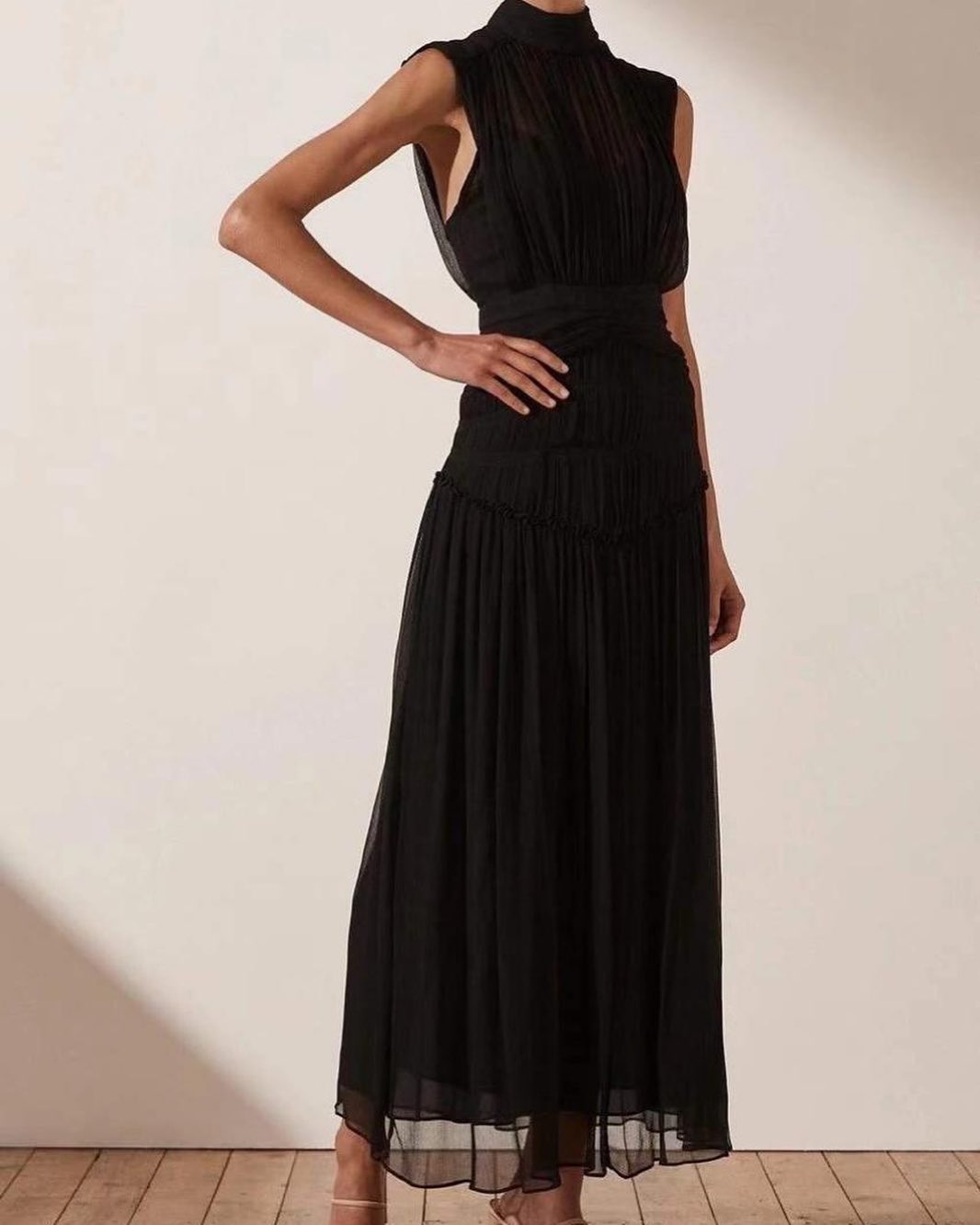 Это элегантное черное платье от бренда LUXE-CRIME, артикул LUX-41552, выполнено в стиле вечернего наряда. Многослойная драпировка на лифе и присборенный пояс подчеркивают талию, создавая женственный силуэт. Длинная, струящаяся юбка с воланами по подолу придает платью особую грацию.