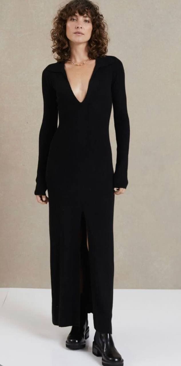 Платье LUX-58169 - это элегантное трикотажное платье макси с длинными рукавами и глубоким V-образным вырезом. Дизайн отличается прилегающим силуэтом, который выгодно подчеркивает фигуру, и высоким разрезом спереди, добавляющим образу соблазнительности. Классический черный цвет делает платье универсальным и подходящим для различных мероприятий.
