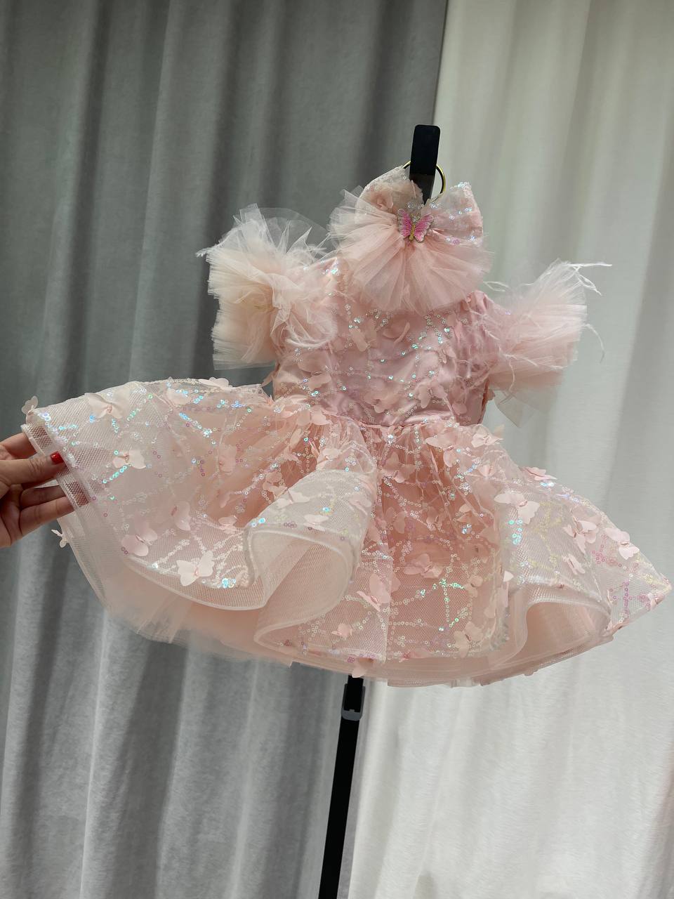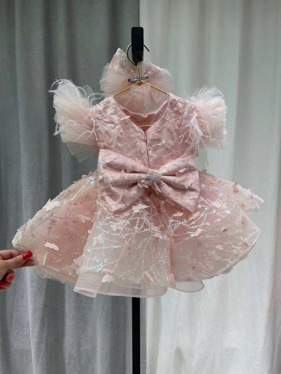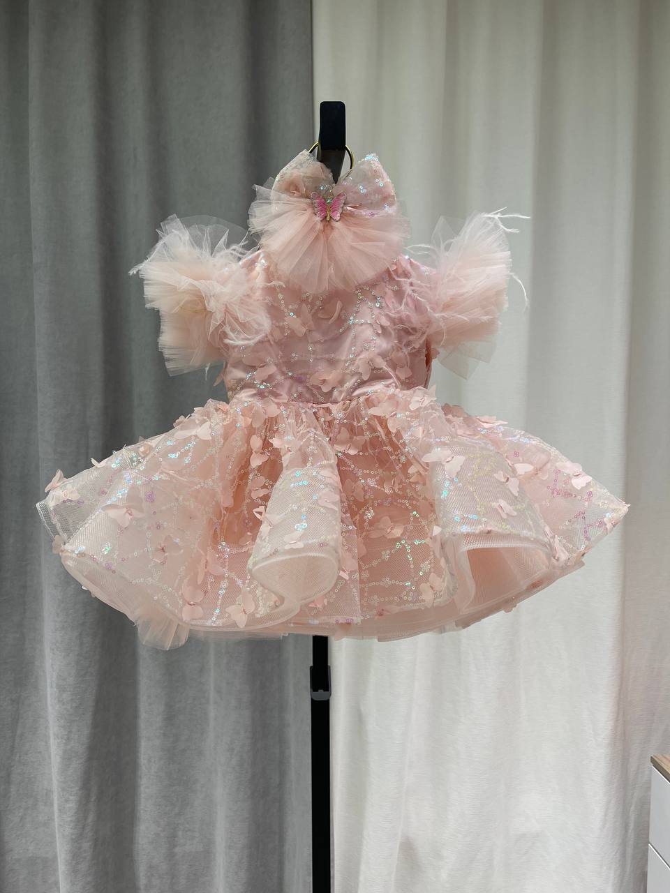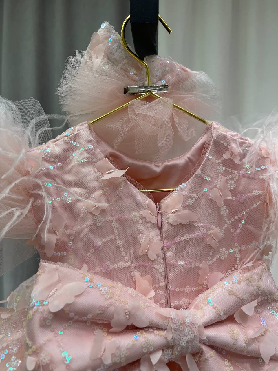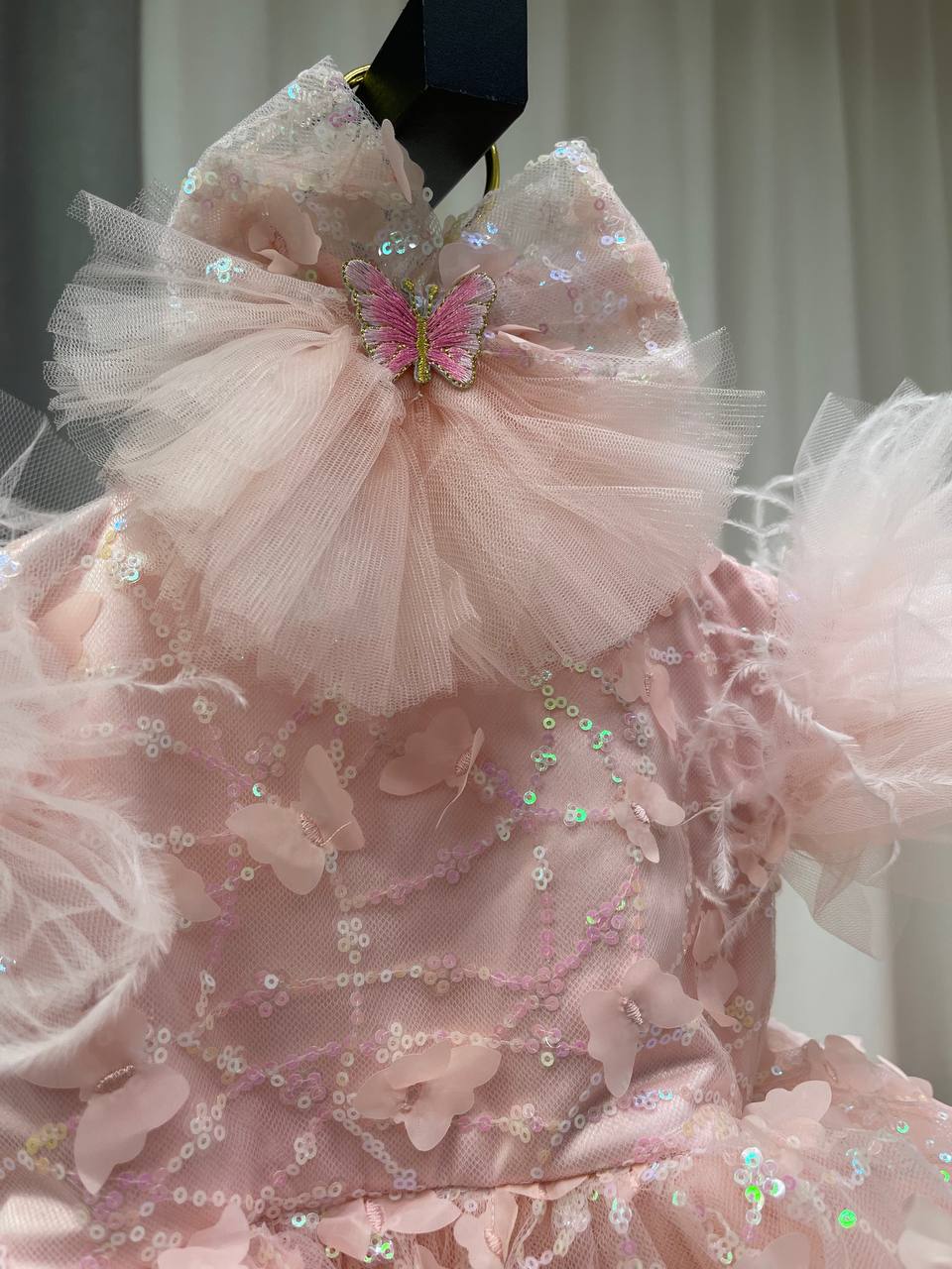 Платье LUX-118708 представляет собой элегантное розовое платье с пышной юбкой, украшенной пайетками и объемными деталями. Дизайн платья включает в себя крылья-вставки, воротник-стойку с украшением в виде бабочки, создавая изысканный и воздушный образ. Идеально подойдет для торжественных мероприятий, праздников или фотосессий.