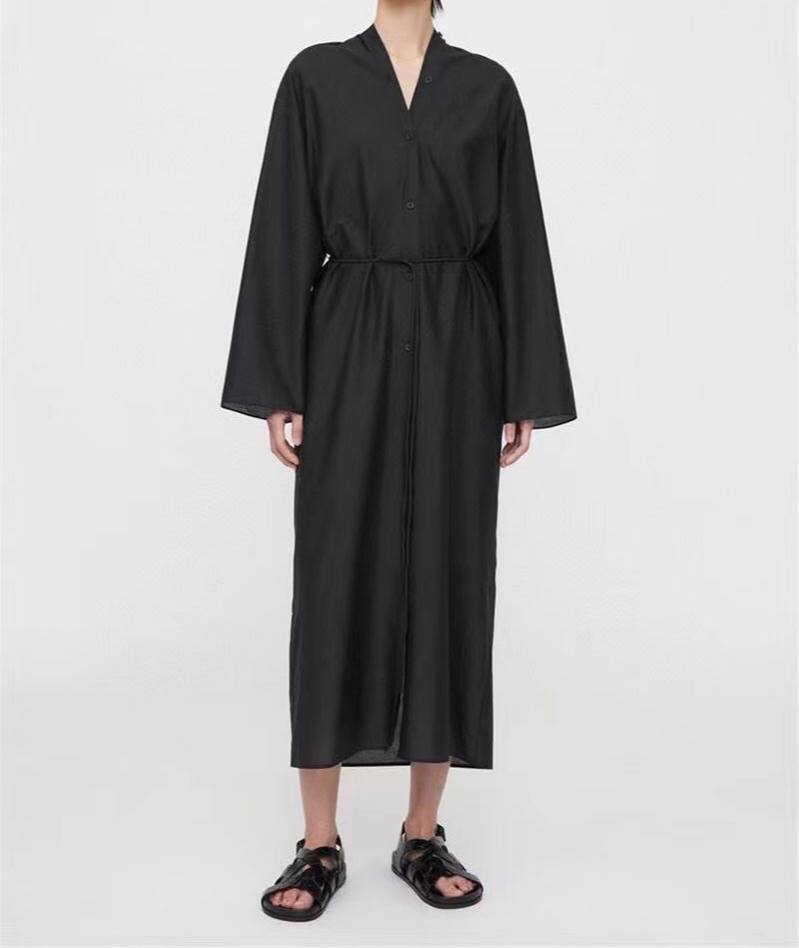 Платье LUX-72655 представляет собой элегантное черное платье-рубашку, выполненное в минималистичном стиле. Модель имеет свободный крой с длинными широкими рукавами, воротником-стойкой и поясом на талии. Это платье идеально подойдет для создания как повседневных, так и более формальных образов.