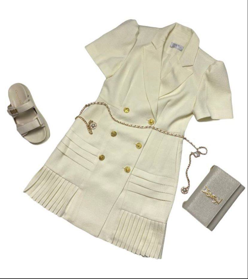 Платье LUX-74709 – элегантное платье-пиджак кремового оттенка с золотистыми пуговицами и акцентной цепочкой на талии. Модель выполнена в классическом стиле с акцентом на женственность, подчеркивая фигуру. Платье идеально подойдет для создания деловых и повседневных образов.