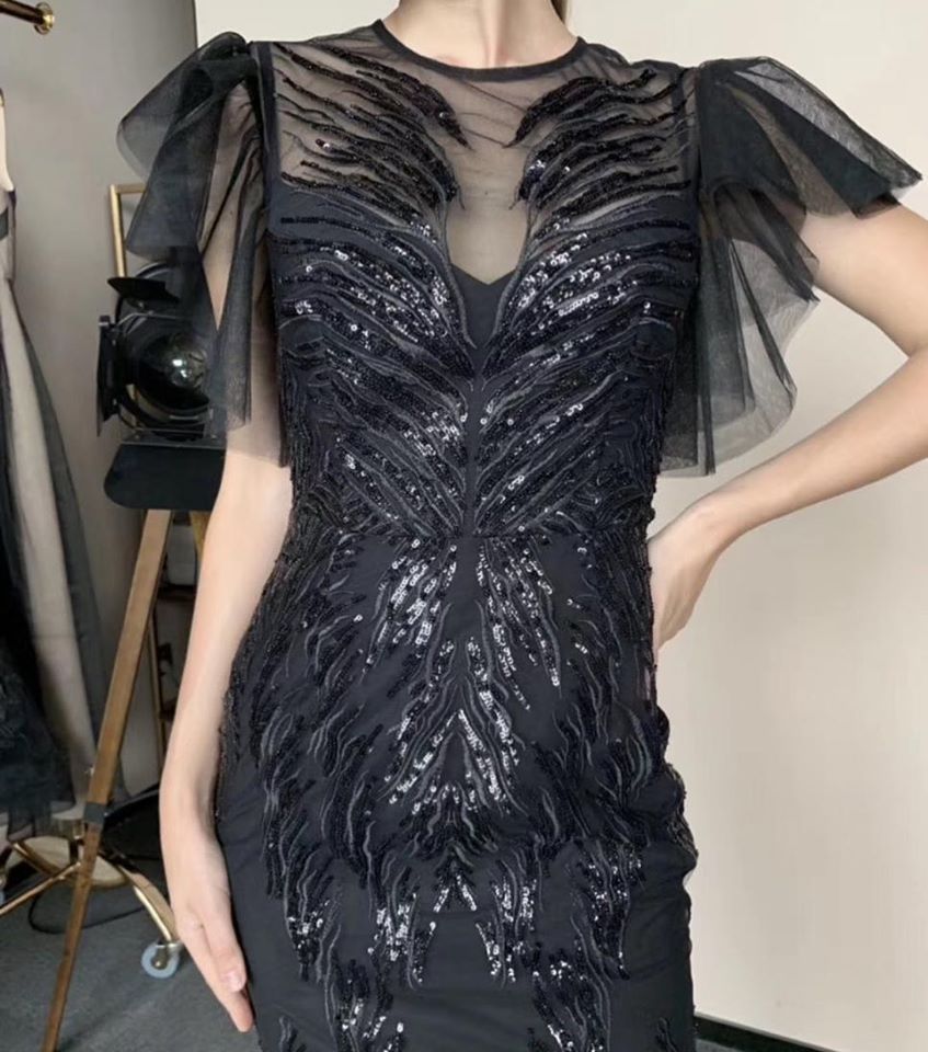 Это эффектное черное платье LUX-25173 – идеальный выбор для особых случаев. Его облегающий силуэт подчеркивает фигуру, а изысканные детали, такие как прозрачная вставка на груди и объемные рукава из сетки, придают образу утонченность. Декоративные элементы в виде пайеток, напоминающих перья, создают завораживающий блеск и привлекают внимание.