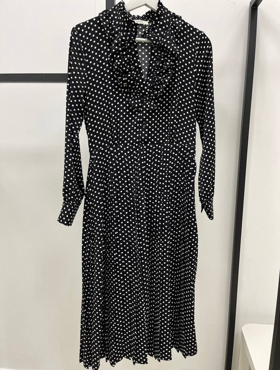 Платье Celine LUX-59953 – это элегантное женское платье в горошек, выполненное в классическом черном цвете с белым принтом. Модель отличается женственным силуэтом и акцентом на талии, что подчеркивает фигуру. Декоративные рюши по воротнику и планке добавляют образу утонченности.