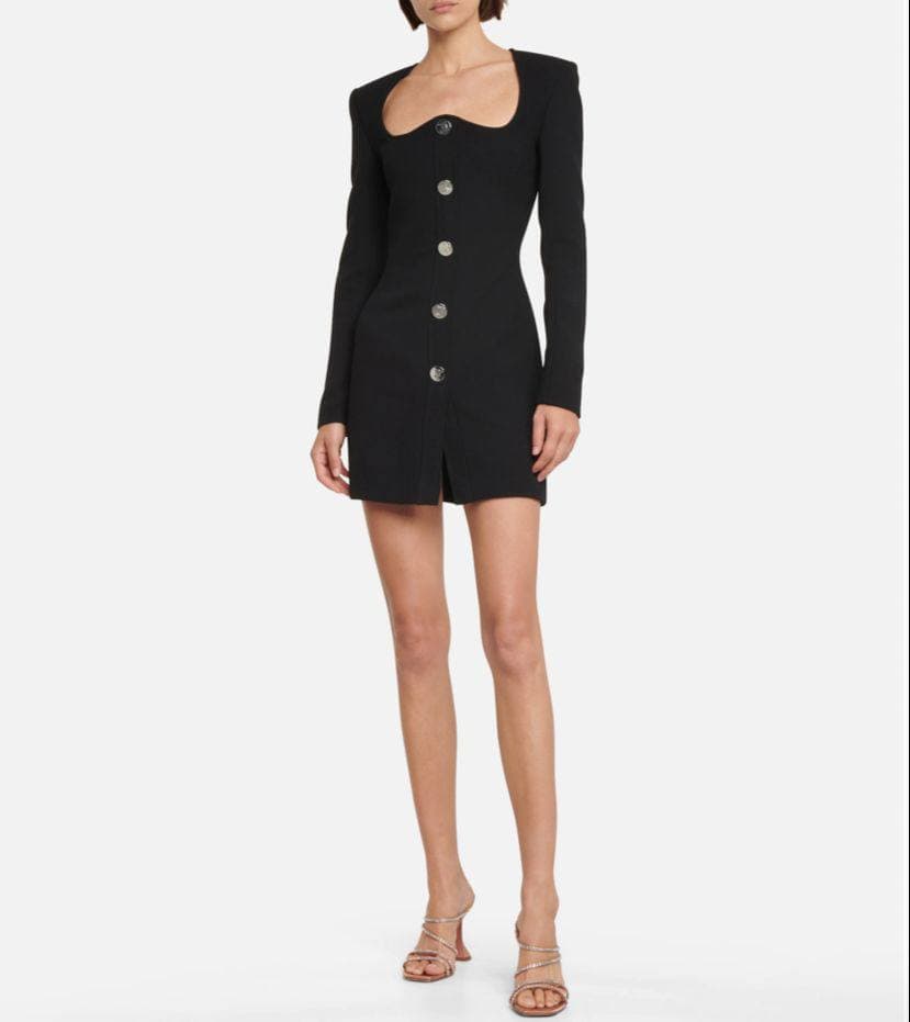 Это облегающее черное мини-платье от LUXE-CRIME с длинными рукавами и пикантным вырезом "сердечко" идеально подойдет для вечеринки или особого случая. Застежка на пуговицы и структурированные плечи добавляют ему элегантности.