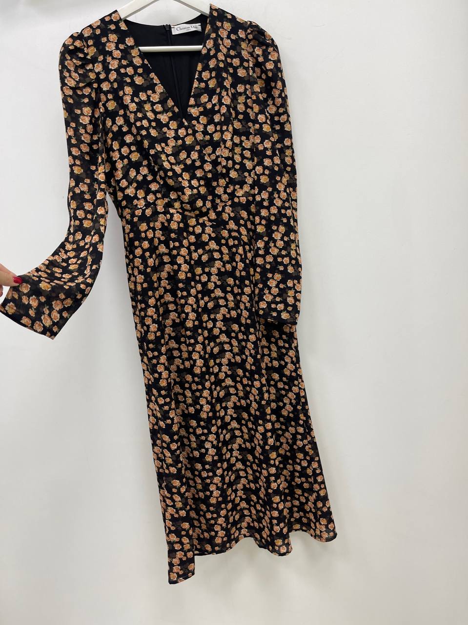 Платье Christian Dior LUX-80240 – это элегантное платье миди, выполненное в романтичном стиле. Платье черного цвета с мелким цветочным принтом в персиковых оттенках. Модель с длинными рукавами и V-образным вырезом.