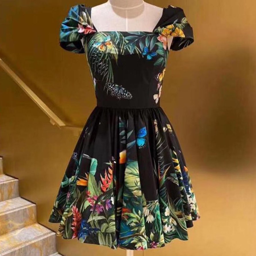 Платье LUX-31369 от Luxe Crime представляет собой воплощение летнего настроения и изысканности. Это короткое платье с пышной юбкой и квадратным вырезом декольте отличается ярким тропическим принтом с изображением экзотических цветов и бабочек на черном фоне, придавая образу особую игривость и женственность.