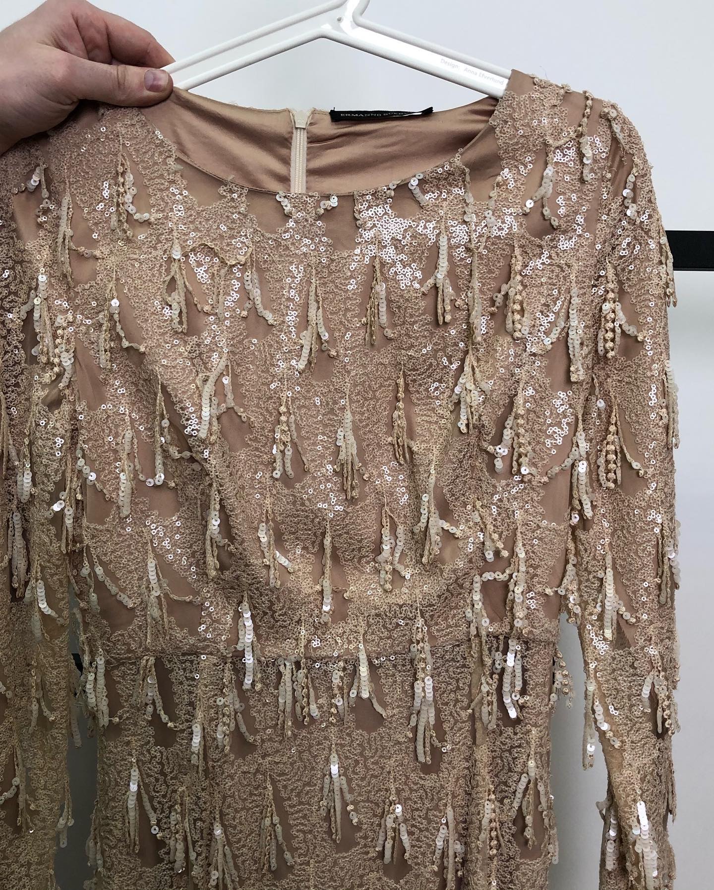 Платье LUX-41127 от бренда Luxe Crime — это изысканное вечернее платье, предназначенное для особых случаев. Его уникальный дизайн с обильной вышивкой пайетками и бахромой создает эффект мерцания и движения, подчеркивая роскошь образа. Платье имеет длинные рукава и облегающий силуэт, который грациозно струится до пола.