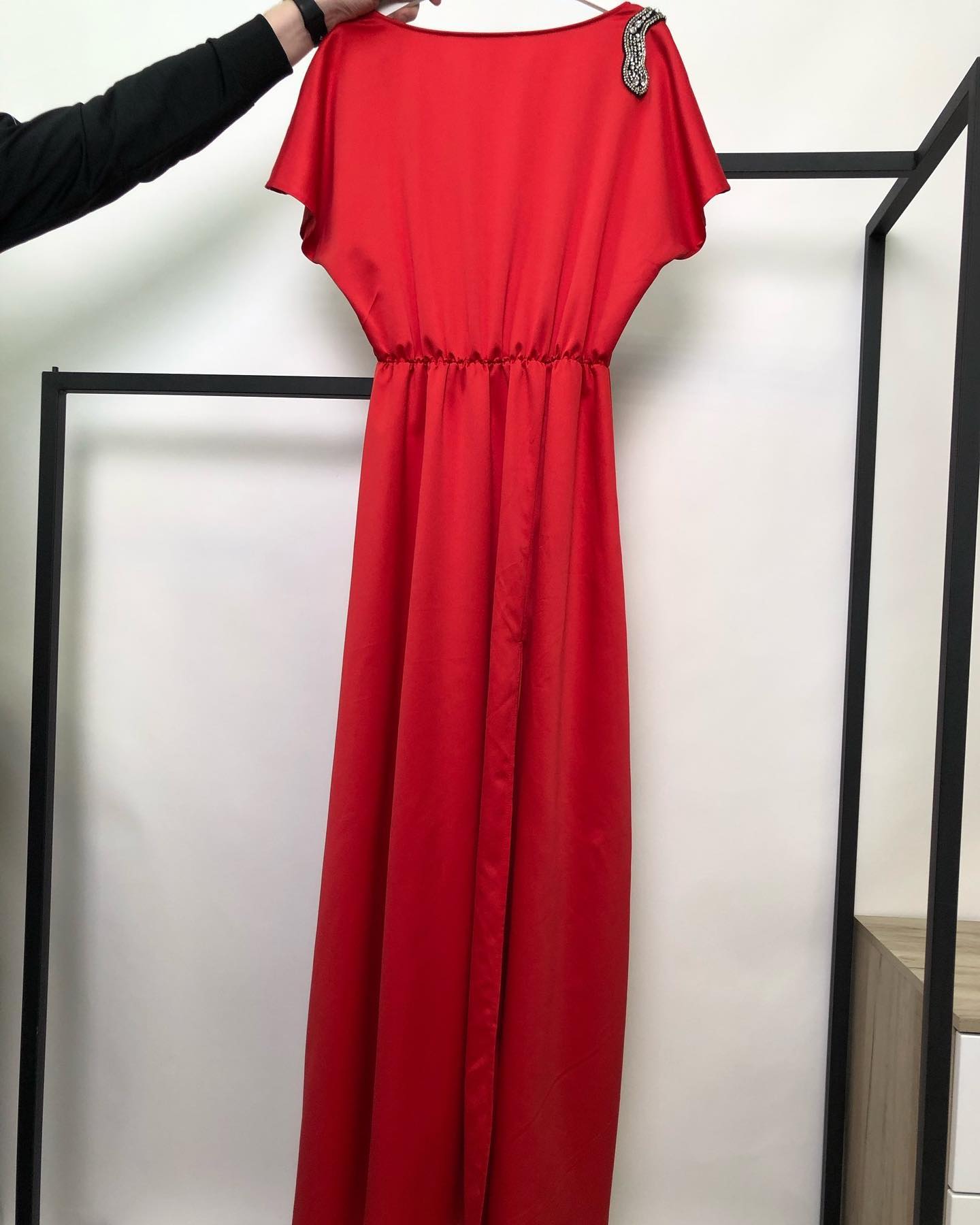 Платье LUX-41420 — это элегантное длинное платье в насыщенном красном цвете, декорированное изящной брошью со стразами на плече. Модель имеет приталенный силуэт благодаря эластичной вставке на талии, короткие рукава-крылышки и струящийся подол. Это платье идеально подходит для особых случаев, вечерних выходов или торжественных мероприятий, подчеркивая женственность и создавая запоминающийся образ.