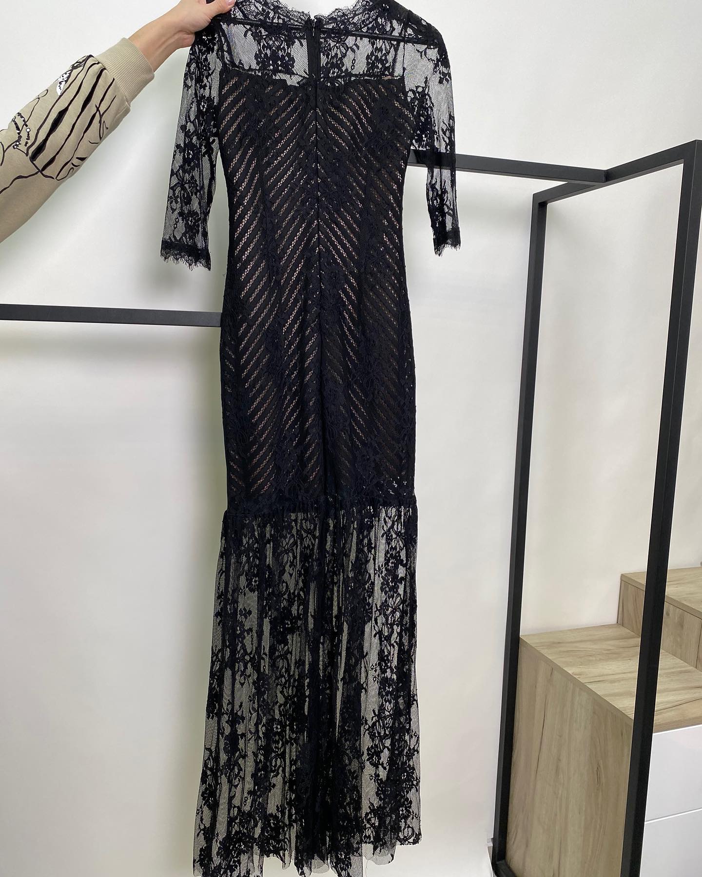 Элегантное черное кружевное платье LUX-41684 от бренда LUXE CRIME — это воплощение изысканности и женственности. Платье выполнено в стиле миди, с длинными рукавами и глубоким V-образным вырезом, подчеркнутым кружевной отделкой. Декоративные элементы в виде зигзагообразного узора на лифе и расклешенный подол из цветочного кружева придают модели особую утонченность.