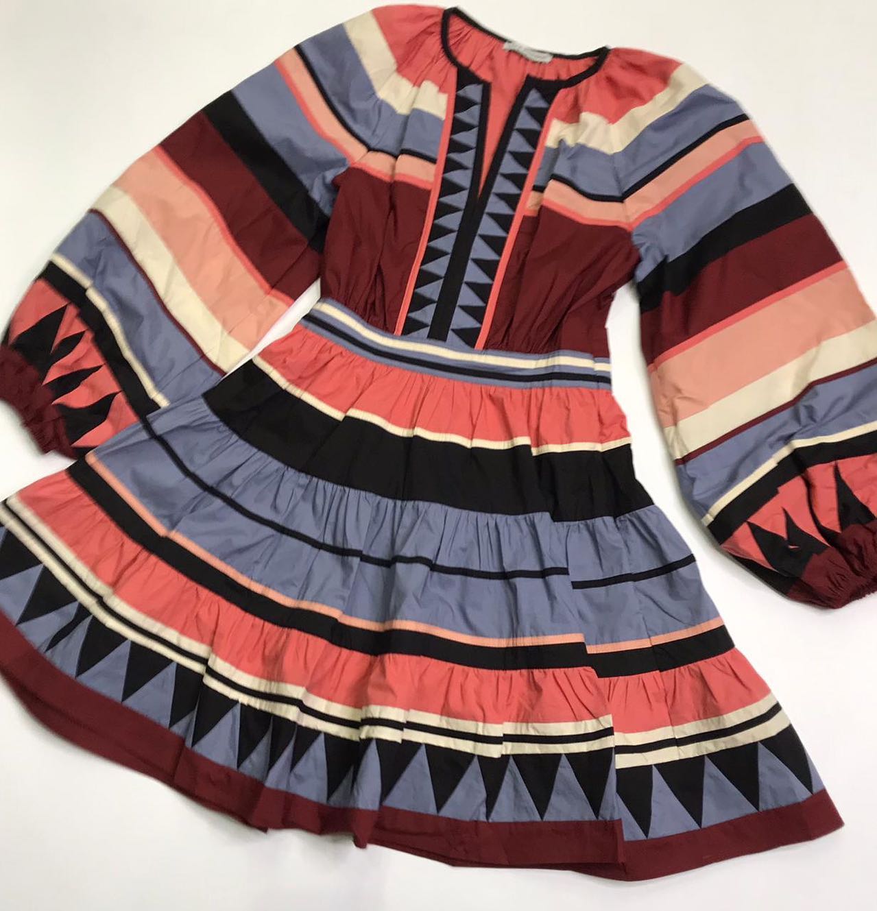 Это яркое и стильное платье LUX-44707 привлечет внимание своим оригинальным дизайном. Платье выполнено в стиле бохо-шик, что подчеркивается свободным кроем, широкими рукавами-фонариками и ярусной юбкой. Оригинальный принт в виде разноцветных полос и геометрических узоров придает платью особый шарм.