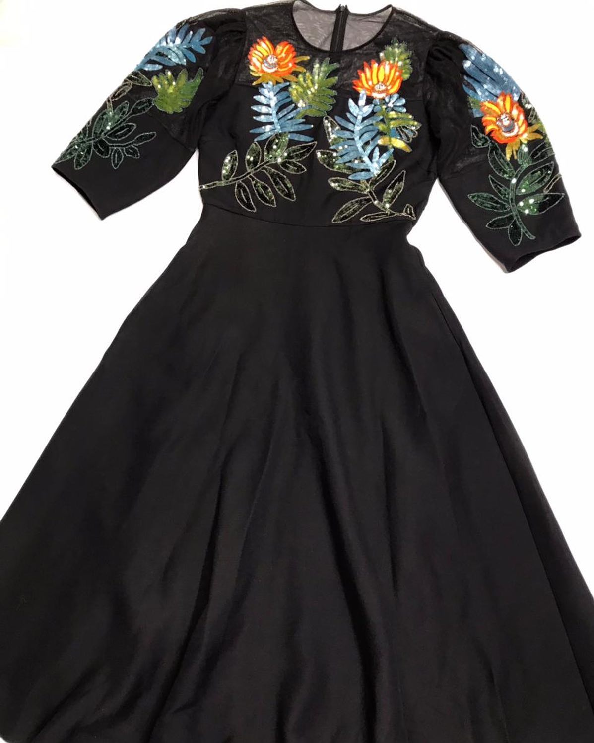 Это элегантное черное платье с полупрозрачным верхом, украшенным яркой вышивкой в виде цветов и листьев, переливающимися пайетками. Модель прекрасно подойдет для особых случаев, вечерних выходов и торжественных мероприятий, создавая изысканный и запоминающийся образ.