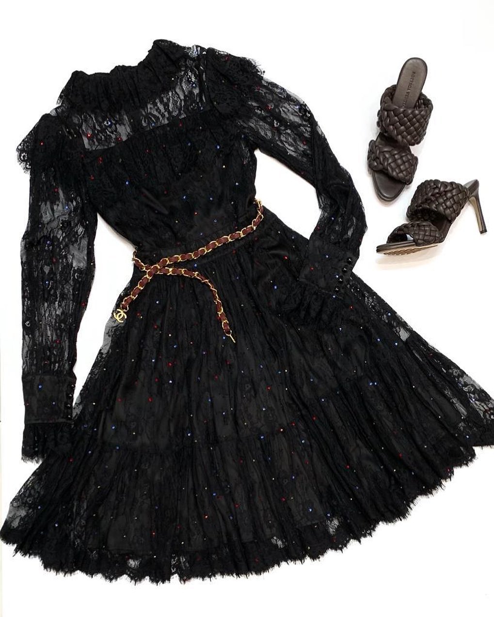 Это элегантное черное кружевное платье LUX-44927 представляет собой изысканное сочетание винтажного шарма и современных деталей. Платье имеет многоярусный расклешенный подол, длинные рукава с кружевными манжетами и высокий воротник, украшенный кружевом. Акцентная деталь в виде ремня с цепочкой и узнаваемым логотипом бренда придает образу дополнительную роскошь. Нежные разноцветные искры, разбросанные по всему платью, создают эффект мерцания, делая его идеальным выбором для особых случаев.