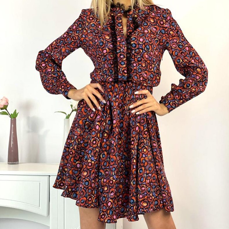 Платье LUX-45220 от бренда LUXE-CRIME – это женственное и стильное решение для создания элегантных образов. Платье выполнено в ярком, абстрактном принте, который привлекает внимание и подчеркивает индивидуальность. Силуэт платья приталенный, с расклешенной юбкой, что создает женственный и утонченный образ. Длинные рукава и воротник-стойка с кружевной отделкой добавляют нотку изысканности.