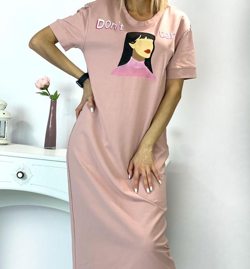Платье LUX-45222 от бренда LUXE CRIME представляет собой стильный и комфортный предмет гардероба для повседневного ношения. Его свободный крой и мягкая ткань делают его идеальным выбором для создания расслабленных образов. Оригинальный принт с изображением девушки и надписью "Don`t Car" придает платью индивидуальность и модный акцент.