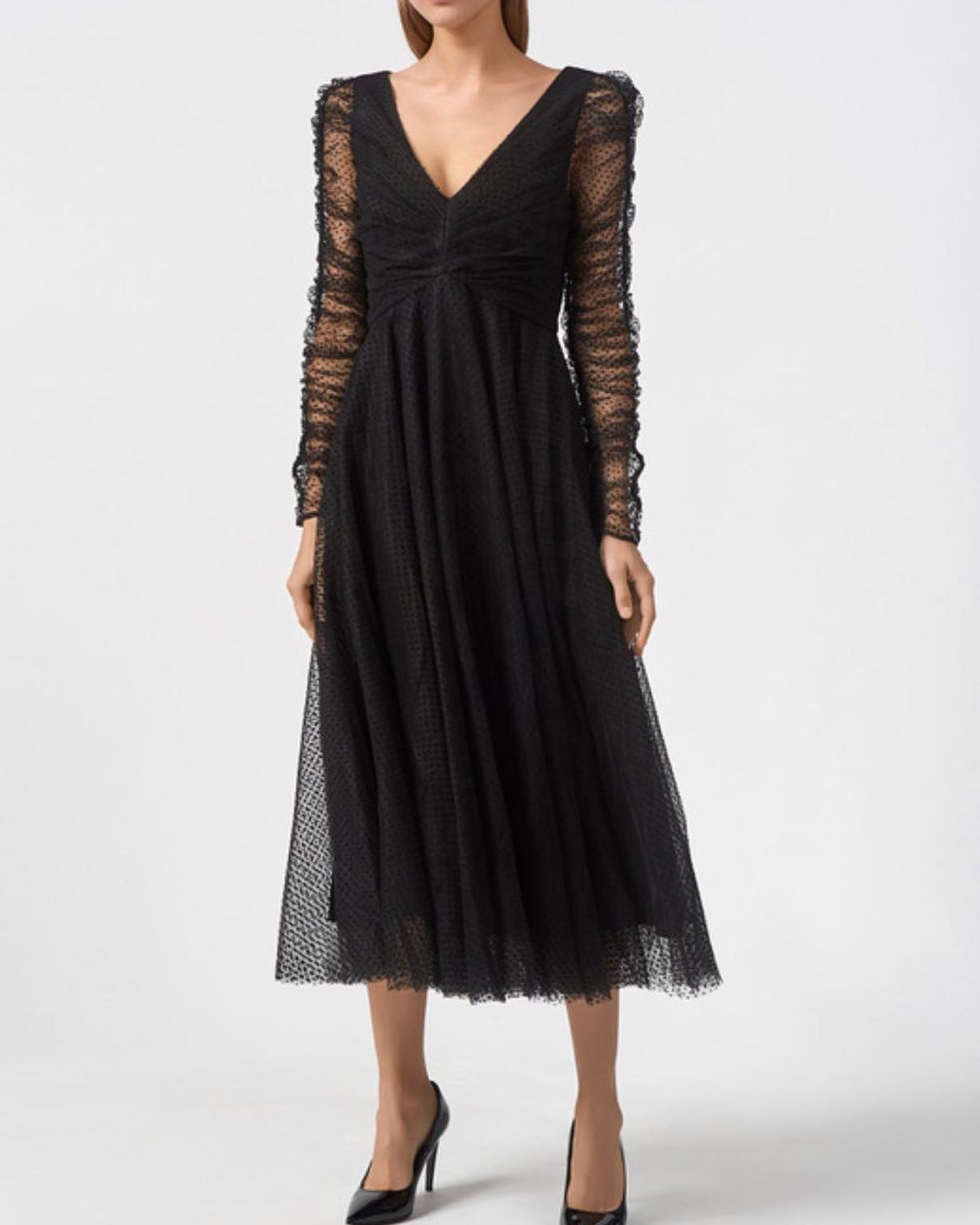 Это элегантное черное платье от LUX-CRIME, артикул LUX-45563, выполнено в изысканном стиле, идеально подходящем для особых случаев. Платье с длинными рукавами из сетки с мелким узором и V-образным вырезом создает утонченный и женственный силуэт. Длина миди и струящаяся юбка подчеркивают изящество фигуры.