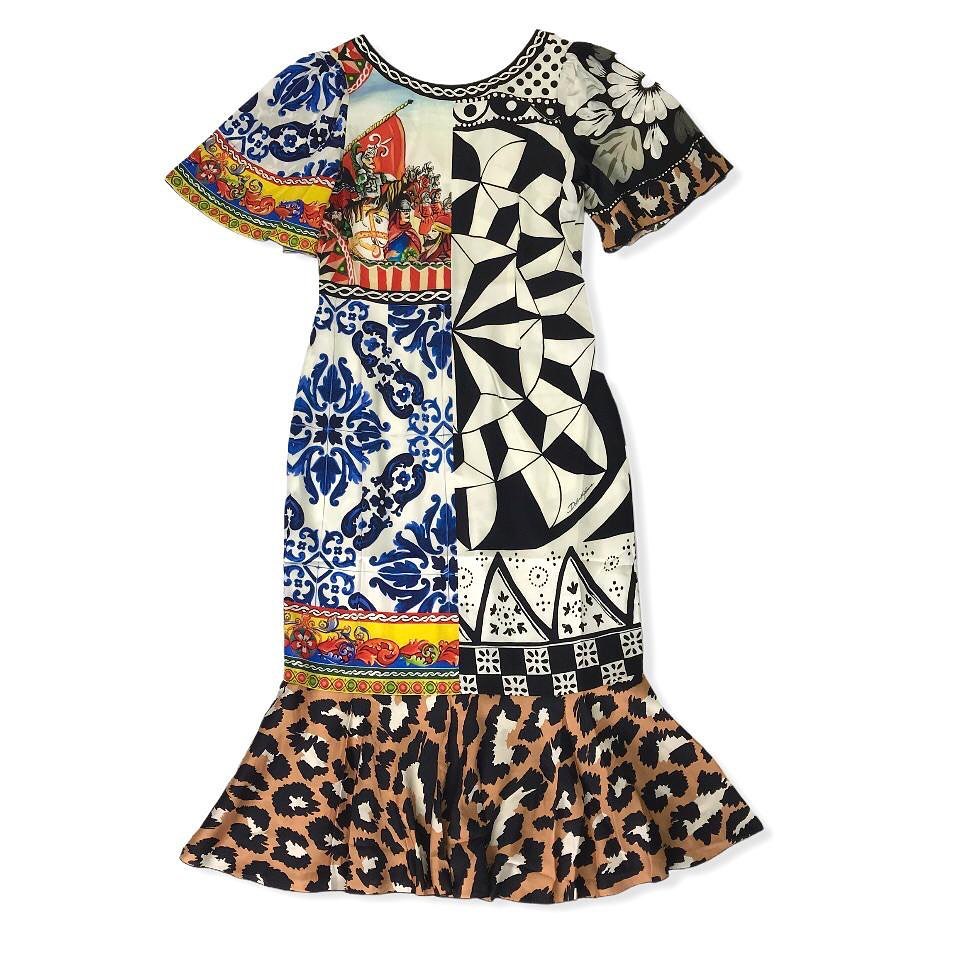 Это яркое платье с короткими рукавами и оборкой на подоле, выполненное в стиле пэчворк, станет эффектным дополнением к вашему гардеробу. Сочетание разнообразных принтов, включая мотивы синей майолики, геометрические узоры, изображение сцены на колеснице и леопардовый принт, создает уникальный и запоминающийся образ. Платье идеально подойдет для создания экстравагантных вечерних или праздничных нарядов, а также для тех, кто ценит смелые модные решения.