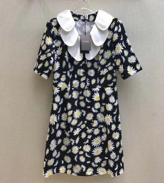 Это очаровательное платье Yves Saint Laurent LUX-47584 с короткими рукавами и объемным белым воротником, украшенное ярким принтом в виде ромашек на черном фоне, привнесет игривость и элегантность в ваш гардероб. Силуэт платья подчеркивает женственность, а контрастное сочетание цветов и узора делает его заметным и стильным. Этот наряд идеально подойдет для летних прогулок, встреч с друзьями или особых случаев, где хочется выглядеть эффектно и непринужденно.