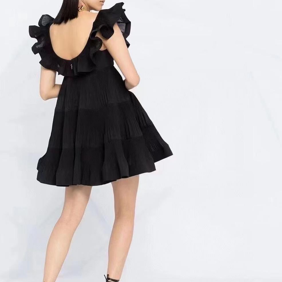Это элегантное черное платье LUX-47745 от бренда LUXE, выполненное в женственном и романтичном стиле. Модель отличается игривыми оборками на плечах и многоярусной юбкой, создающей объем и динамику. Идеальный выбор для особых случаев или вечерних выходов.