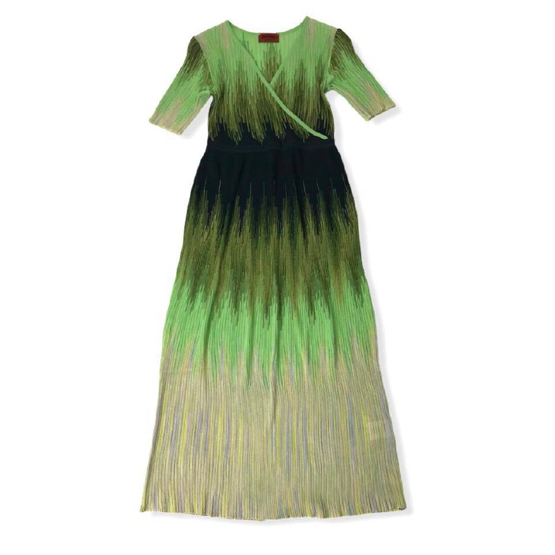 Это платье-миди от MISSONI с V-образным вырезом и характерным для бренда плиссированным дизайном. Модель выполнена в градиентной расцветке, переходящей от темно-синего к ярко-зеленому и светло-желтому, что создает эффект мерцания. Платье идеально подходит для создания элегантных вечерних и повседневных образов.