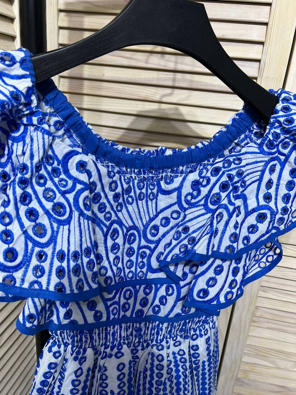 Платье LUX-89159 - это летнее платье миди, выполненное в белом цвете с синим орнаментом. Платье имеет открытые плечи, что добавляет образу легкости и женственности. Дизайн платья делает его идеальным выбором для летних прогулок и отдыха.