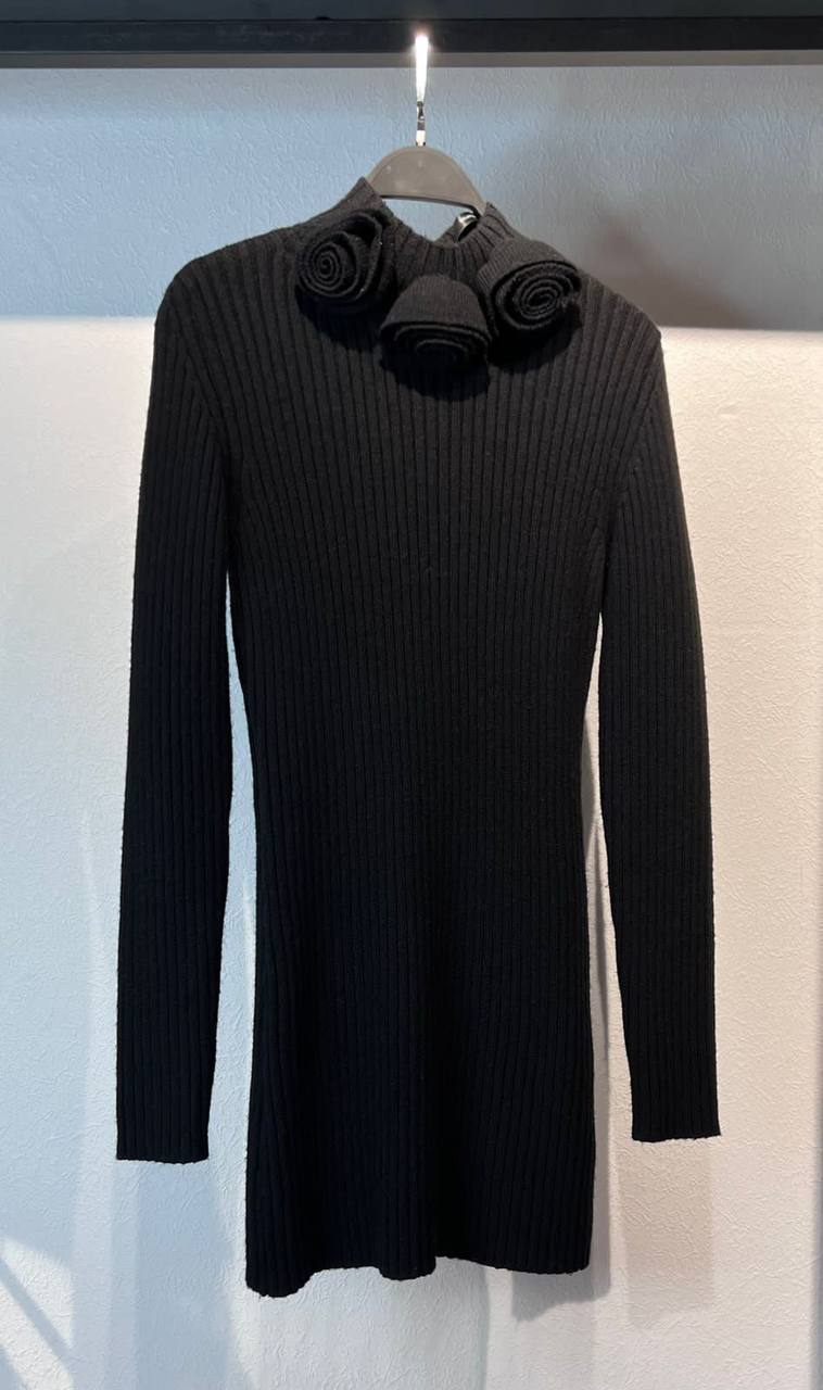 Платье LUXE-96866 представляет собой элегантное черное платье, выполненное в стиле минимализма. Платье имеет облегающий силуэт и длинные рукава. Дизайн дополнен декоративными элементами в виде цветов на воротнике.