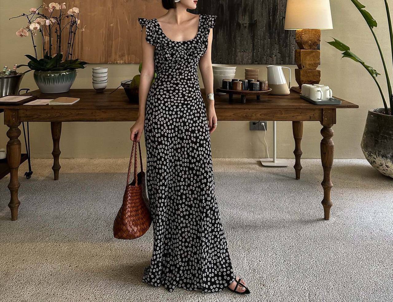 Платье LUX-105539 представляет собой изящное платье в цветочный принт. Модель выполнена в длине макси, с небольшими рукавами-крыльями и элегантным вырезом. Черный фон платья дополнен белым цветочным узором, создавая женственный и привлекательный образ.