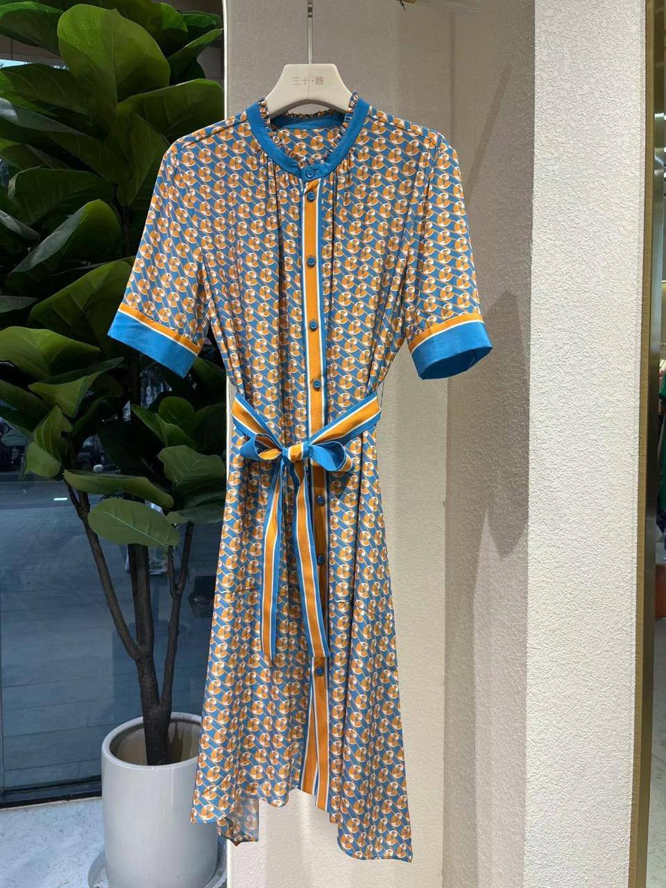 Платье LUX-106989 – это элегантное платье рубашечного кроя, выполненное в ярком, но сдержанном стиле. Платье имеет насыщенный синий фон с оранжевым геометрическим принтом, контрастные синие манжеты, воротник и планку с пуговицами, а также пояс-ленту на талии. Оно идеально подойдет для создания утонченного и стильного образа.