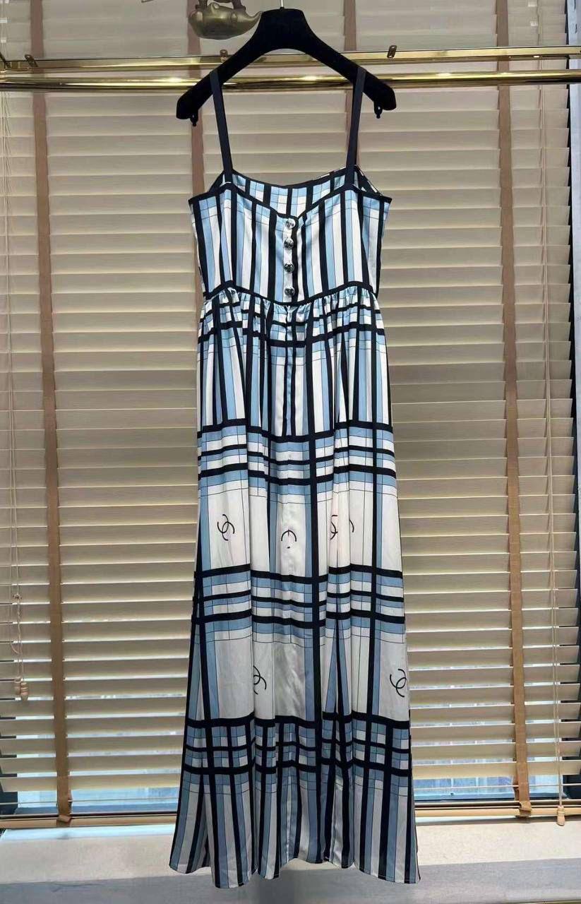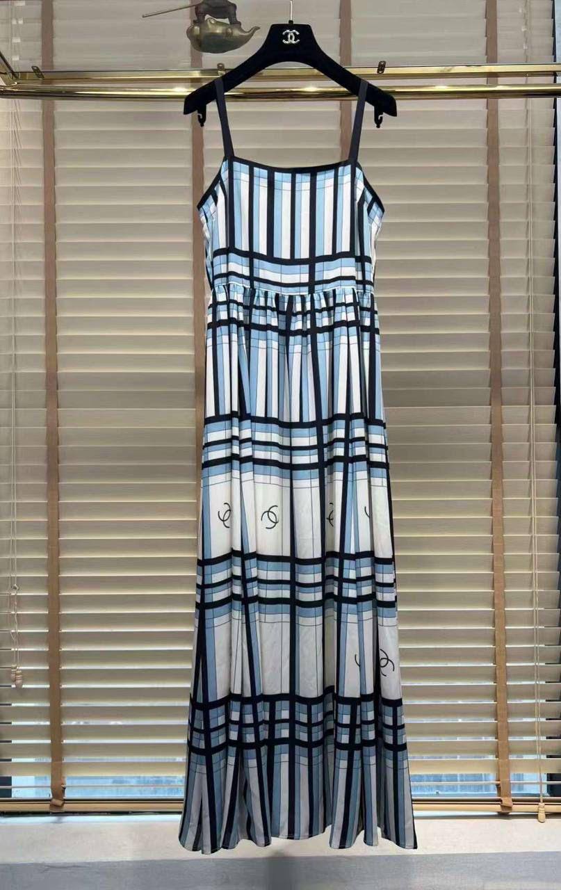 Платье Chanel LUX-107322 представляет собой элегантное платье-сарафан. Этот предмет гардероба выполнен в стиле casual, с ярким графическим принтом, напоминающим клетку. Цветовая гамма включает в себя сочетание белого, голубого и черного цветов. Платье имеет регулируемые бретели и декорировано пуговицами.
