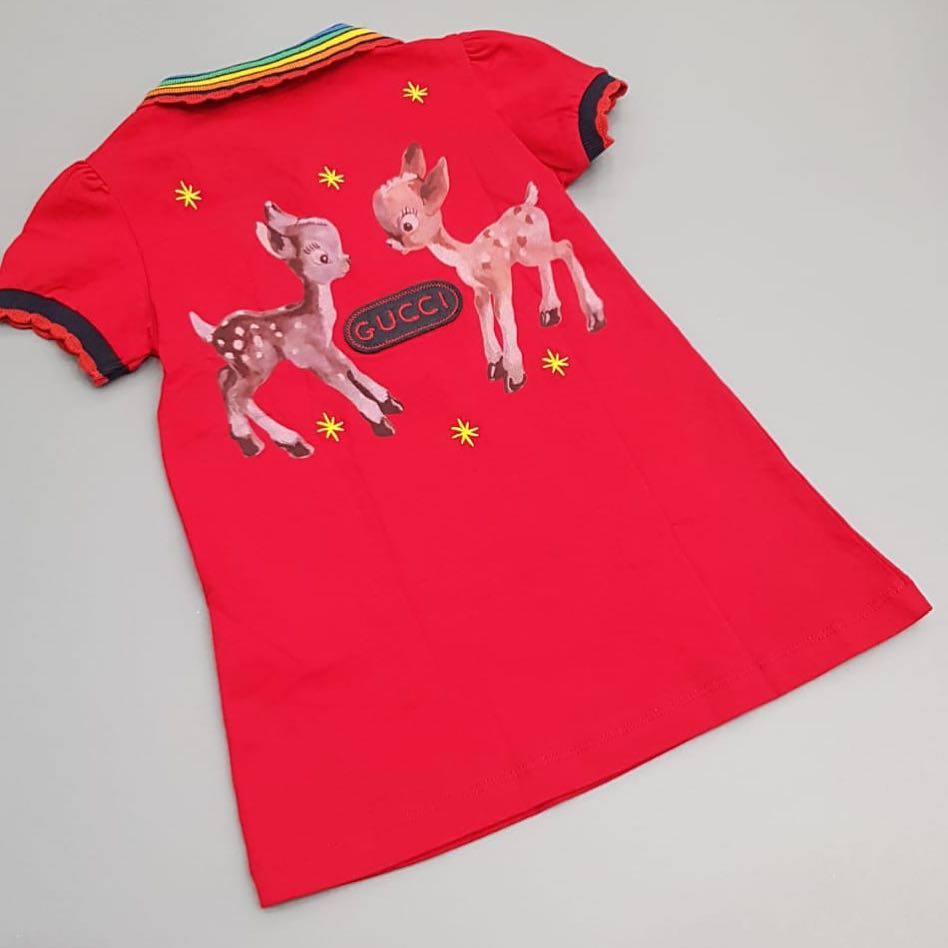 Представляем вам очаровательное Платье детское Gucci LUX-9520. Это яркое красное платье с короткими рукавами и воротником-поло, украшенным разноцветной радужной полосой, идеально подойдет для маленьких модниц. Модель застегивается на две белые пуговицы и декорирована сине-черной полосой на манжетах, добавляя спортивный акцент.