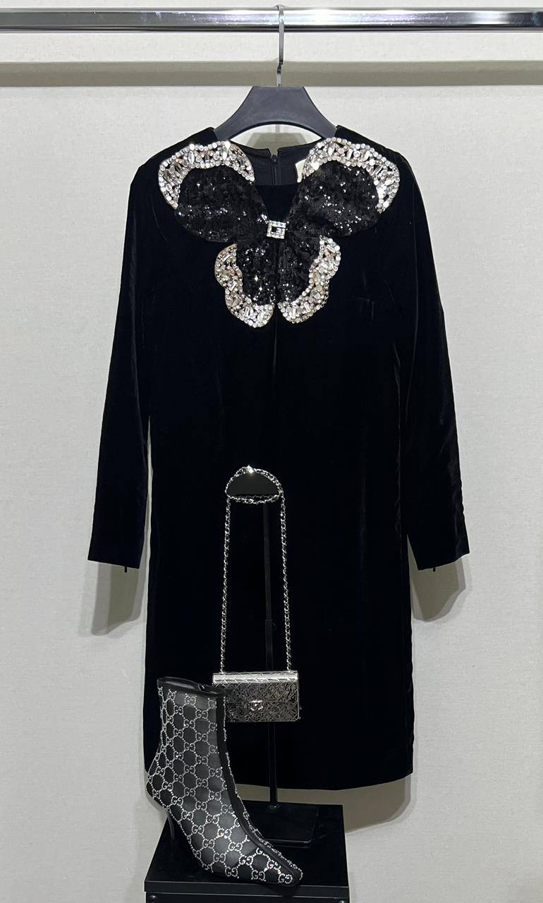 Платье LUX-113211 представляет собой элегантное черное платье, выполненное в классическом стиле. Оно имеет длинные рукава и декорировано крупным бантом, украшенным пайетками и стразами. Такое платье может быть отличным выбором для вечернего выхода.