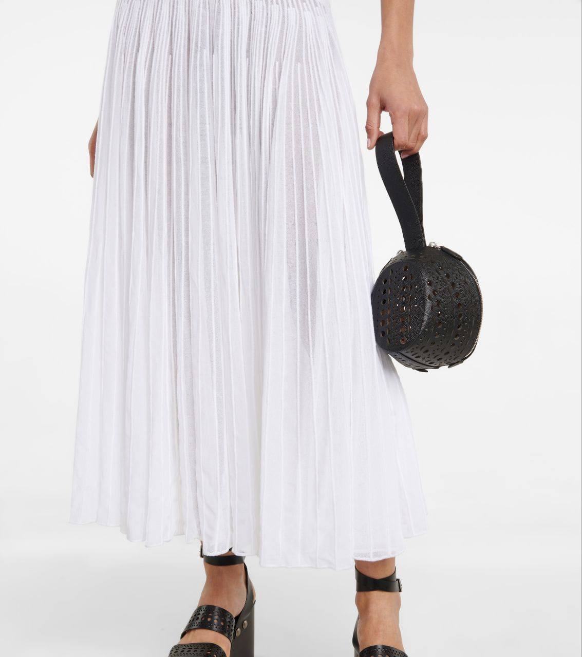 Платье Alaia LUX-113403 — элегантное белое платье, которое сочетает в себе современный дизайн и утонченный стиль. Верх платья выполнен из ткани с горизонтальными рельефными полосами, а юбка — плиссированная. Идеально подходит для создания эффектного образа.