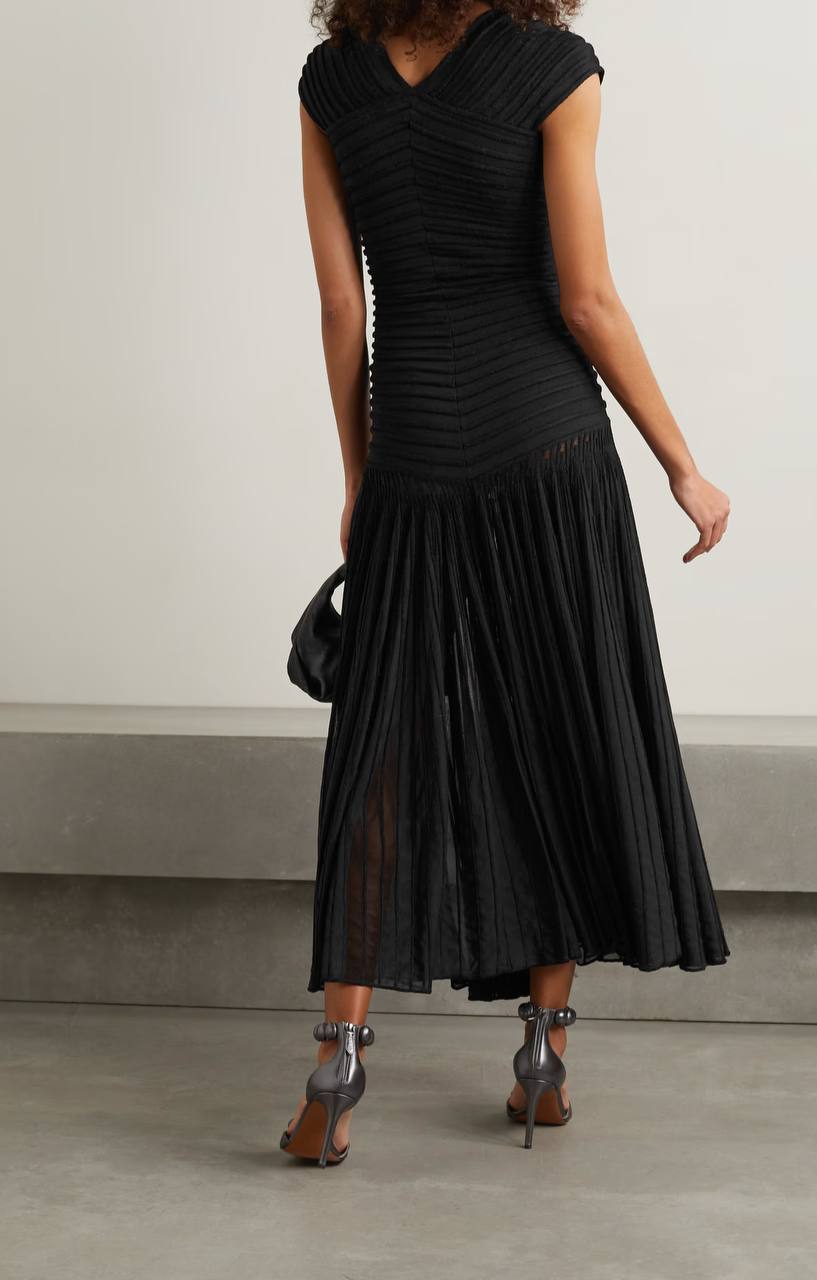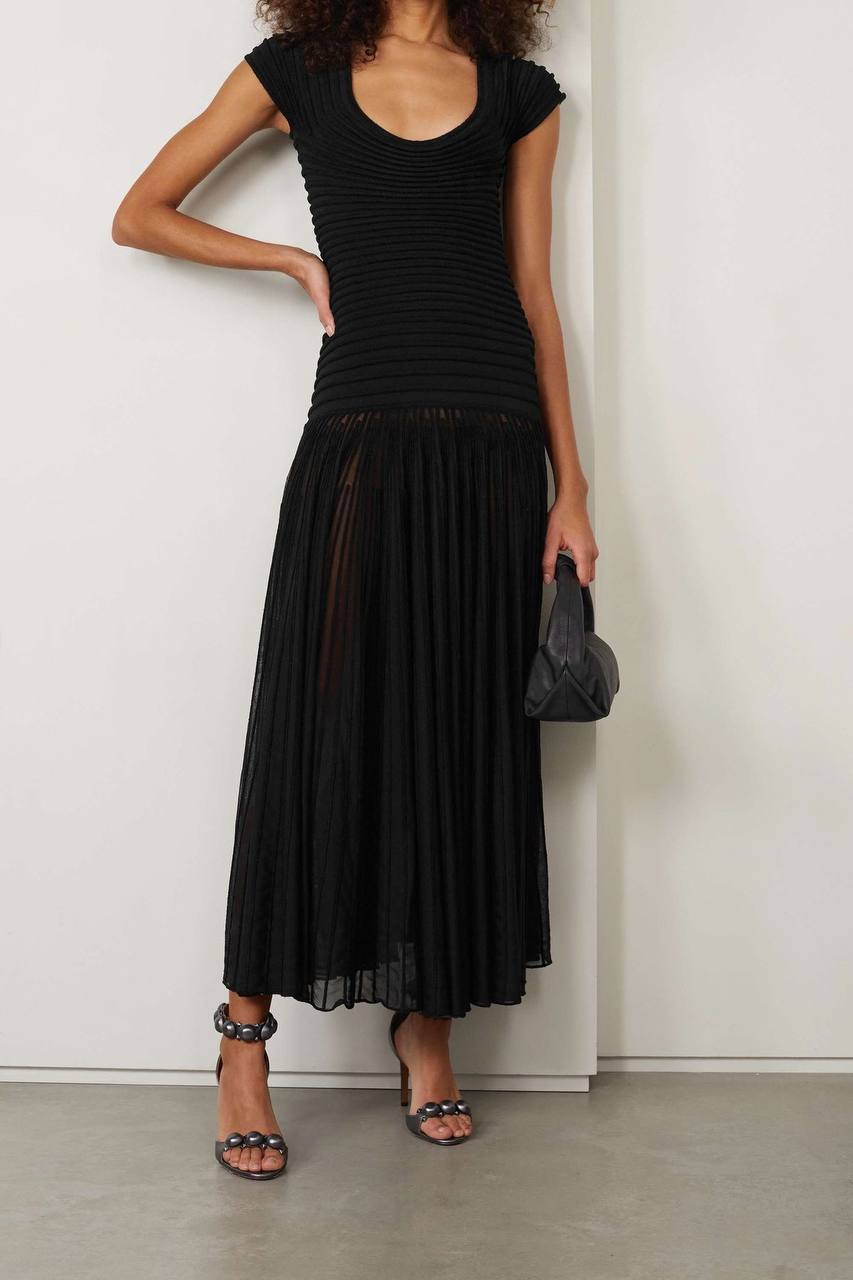 Платье Alaia LUX-113404 - это элегантное черное платье, которое сочетает в себе изысканность и современный стиль. Оно имеет контрастную текстуру: верхняя часть выполнена из гладкого материала, а нижняя - из плиссированной ткани, создавая изящный силуэт. Это платье идеально подходит для создания утонченных образов.
