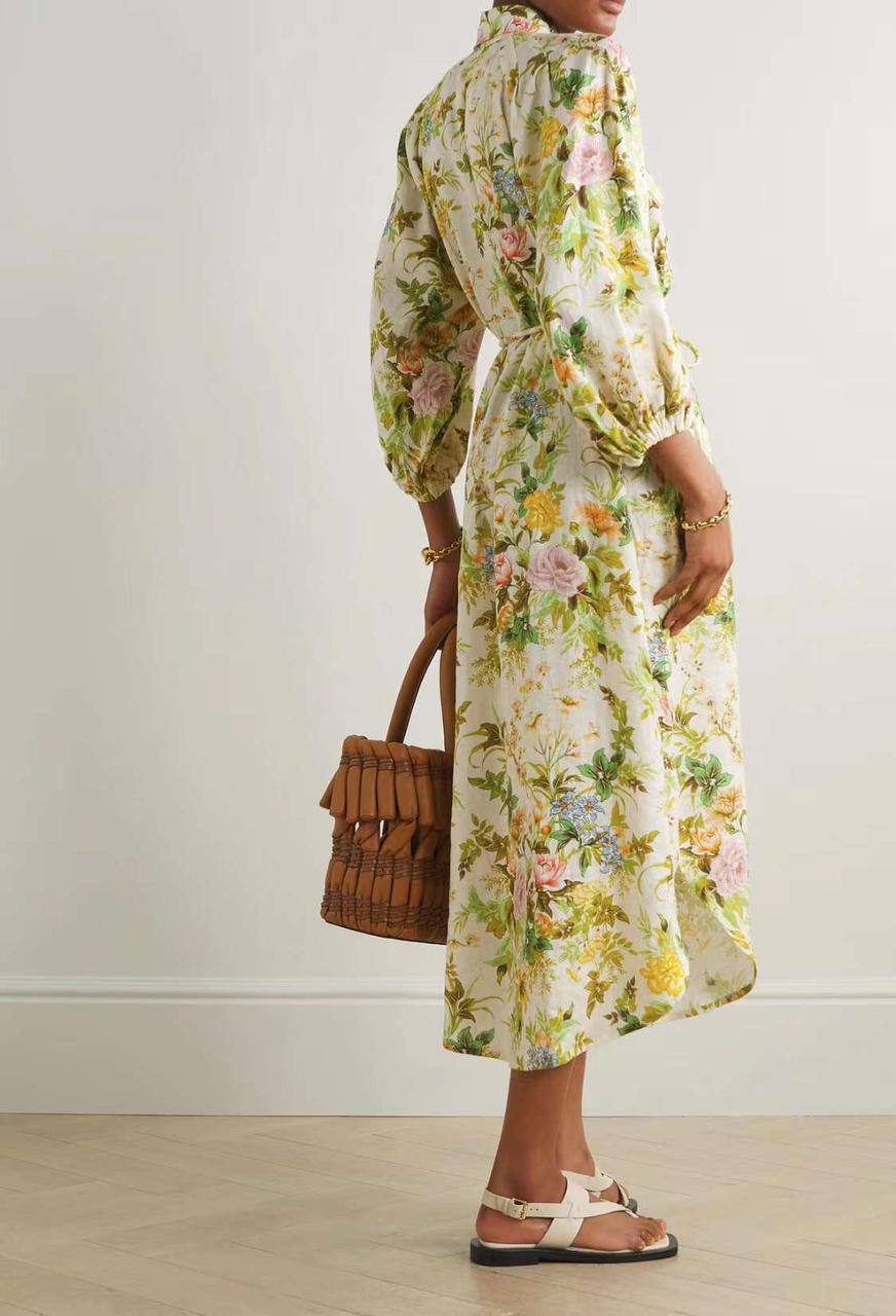 Платье Alemais LUX-90674 представляет собой элегантное платье-рубашку с цветочным принтом, выполненное в светлых тонах с преобладанием белого, зеленого и розового. Платье имеет свободный крой, длинные рукава с манжетами, воротник-стойку и застежку на пуговицы по всей длине. Оно дополнено поясом на талии для создания акцента на фигуре и боковыми карманами.
